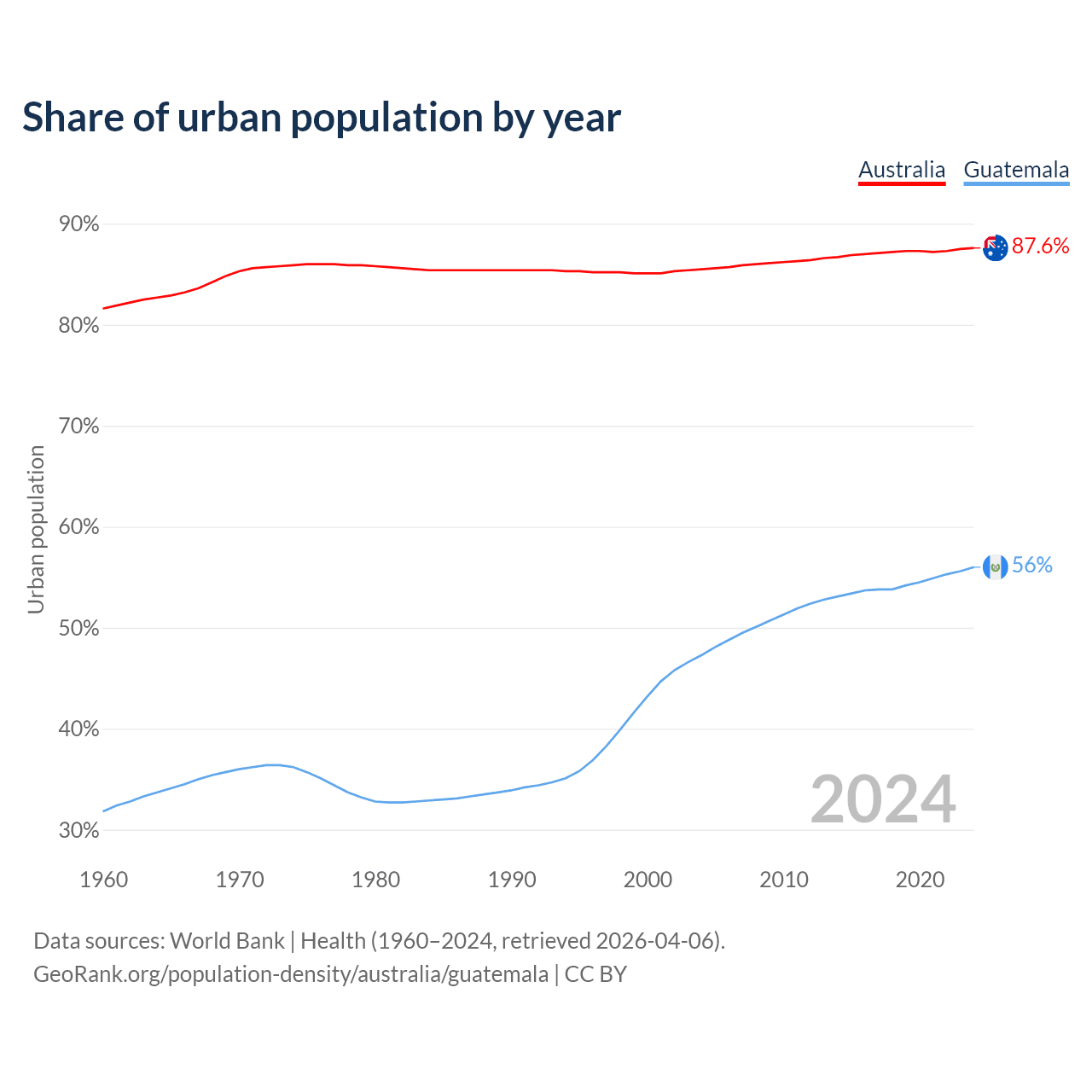 From 2004 to 2024, the share of urban population changed from 85.5% to 87.6% in Australia and from 47.3% to 56% in Guatemala.