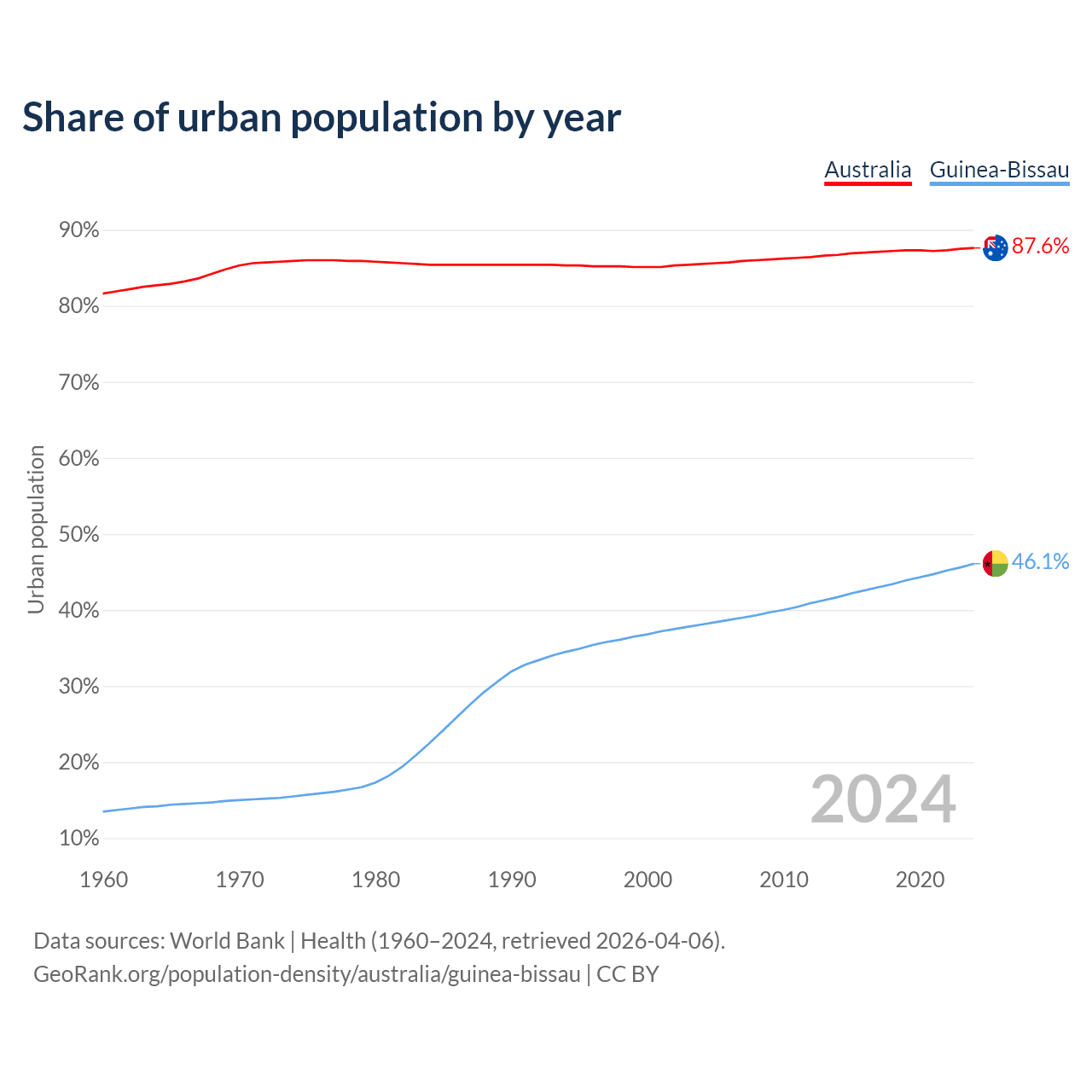 From 2004 to 2024, the share of urban population changed from 85.5% to 87.6% in Australia and from 38.1% to 46.1% in Guinea-Bissau.