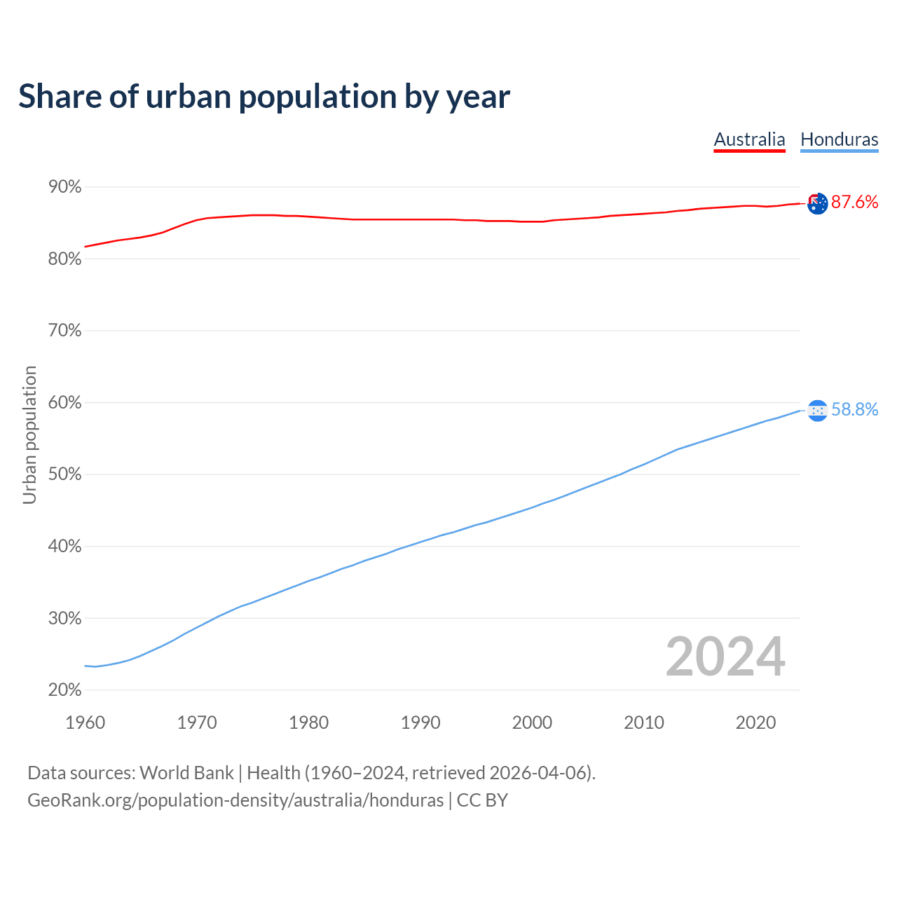 From 2004 to 2024, the share of urban population changed from 85.5% to 87.6% in Australia and from 47.6% to 58.8% in Honduras.