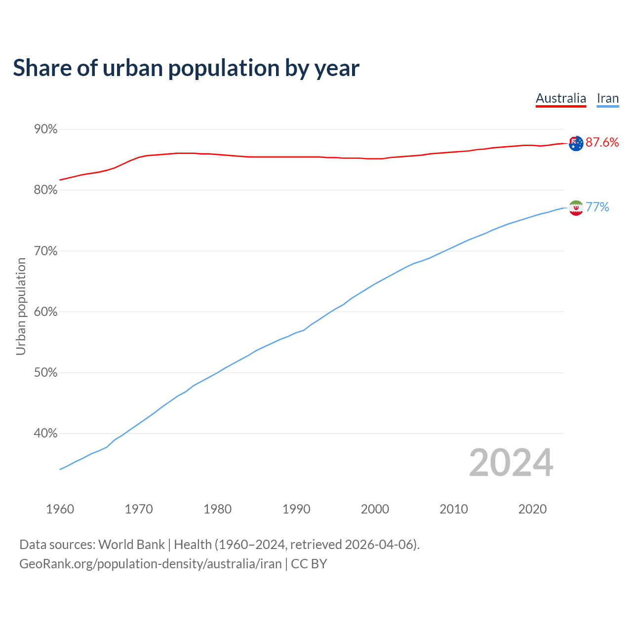 From 2004 to 2024, the share of urban population changed from 85.5% to 87.6% in Australia and from 67.3% to 77% in Iran.