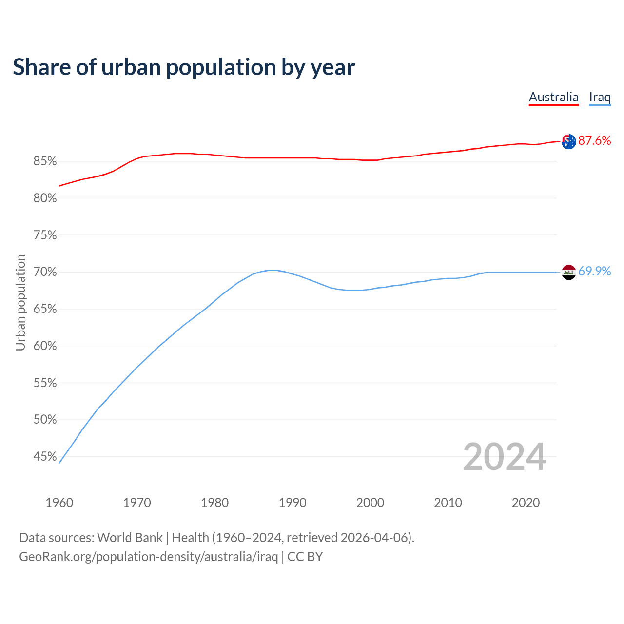From 2004 to 2024, the share of urban population changed from 85.5% to 87.6% in Australia and from 68.2% to 69.9% in Iraq.