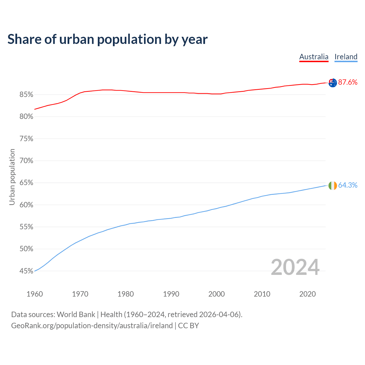 From 2004 to 2024, the share of urban population changed from 85.5% to 87.6% in Australia and from 60.2% to 64.3% in Ireland.
