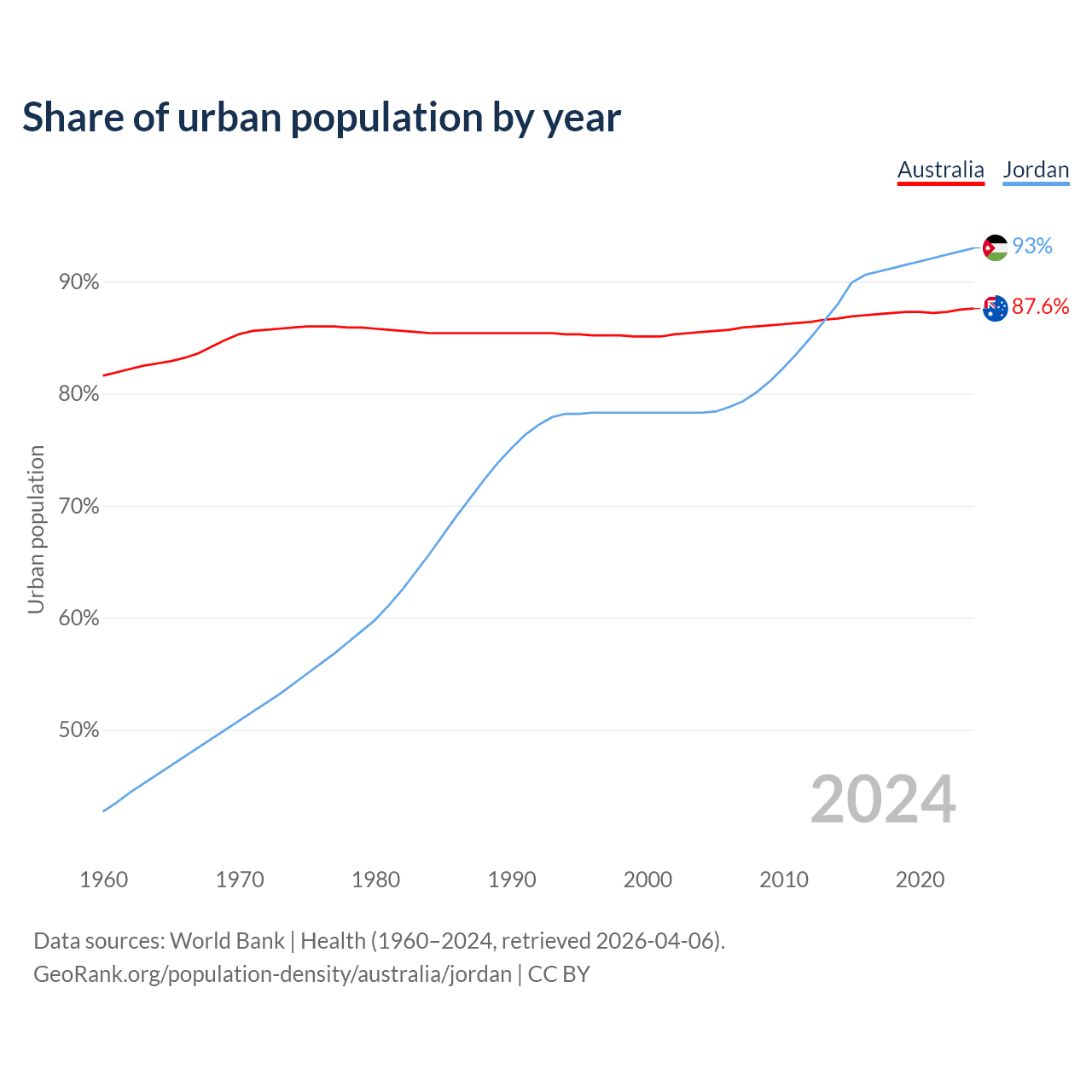 From 2004 to 2024, the share of urban population changed from 85.5% to 87.6% in Australia and from 78.3% to 93% in Jordan.