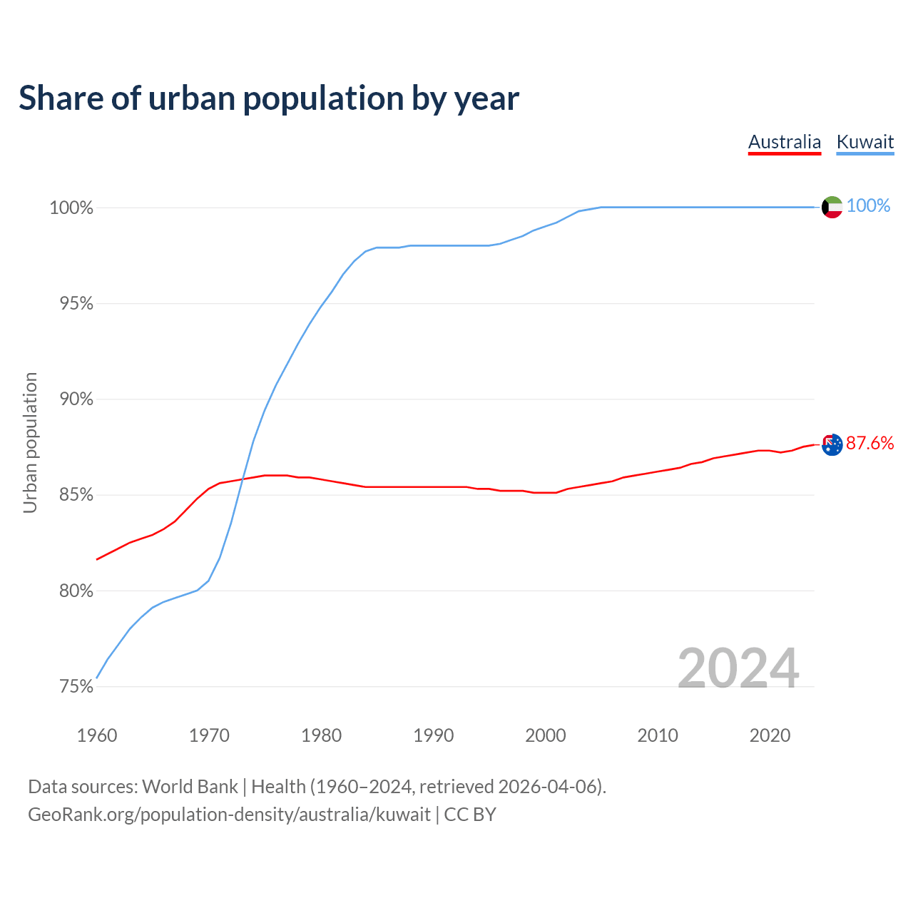 From 2004 to 2024, the share of urban population changed from 85.5% to 87.6% in Australia and from 99.9% to 100% in Kuwait.