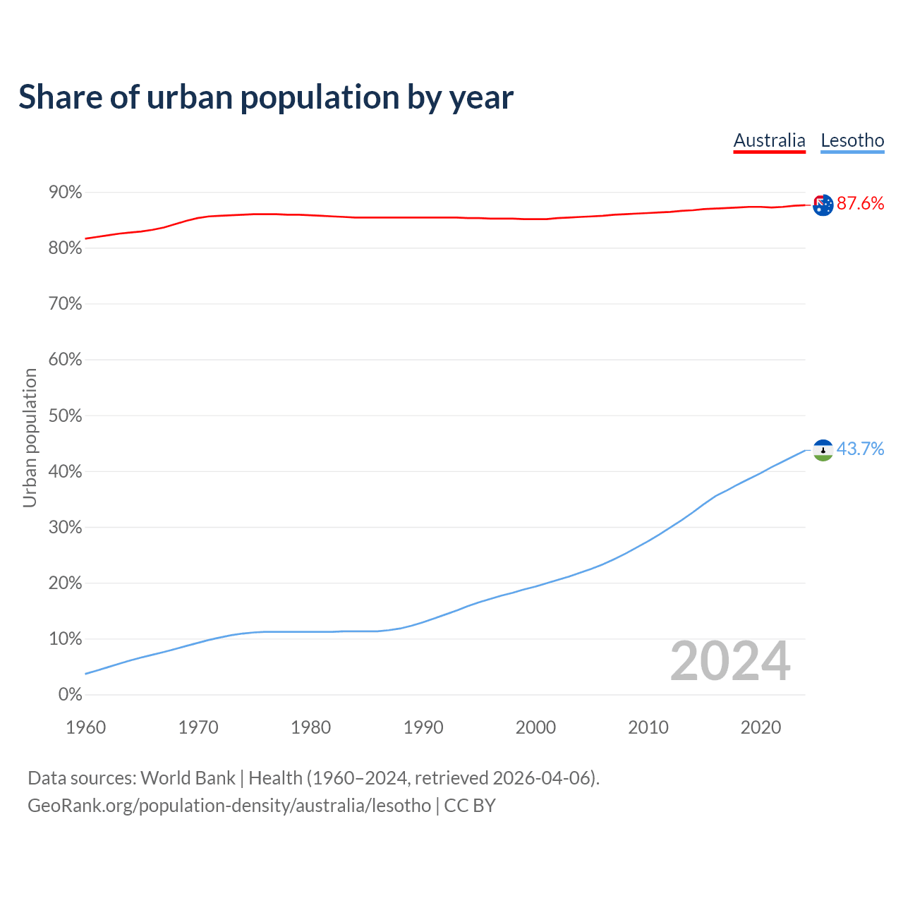 From 2004 to 2024, the share of urban population changed from 85.5% to 87.6% in Australia and from 21.8% to 43.7% in Lesotho.