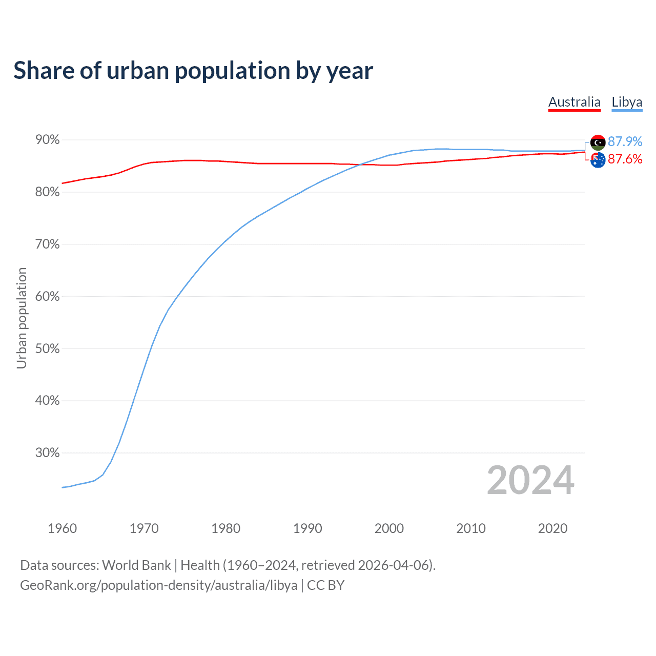 From 2004 to 2024, the share of urban population changed from 85.5% to 87.6% in Australia and from 88% to 87.9% in Libya.
