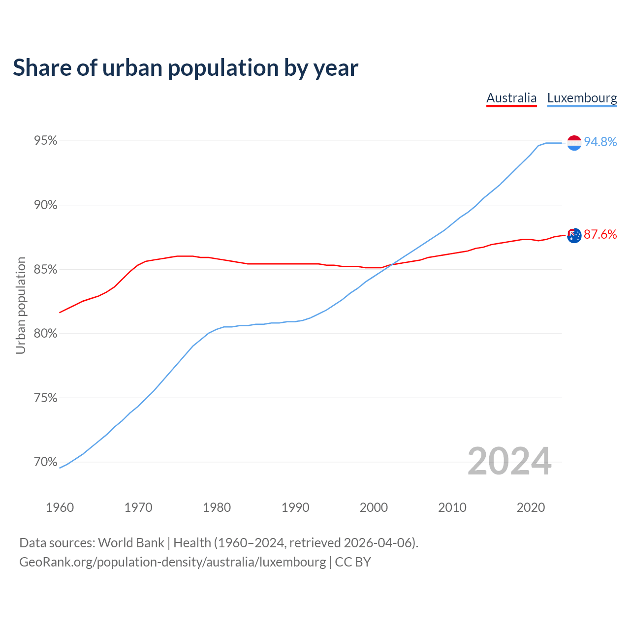 From 2004 to 2024, the share of urban population changed from 85.5% to 87.6% in Australia and from 86% to 94.8% in Luxembourg.
