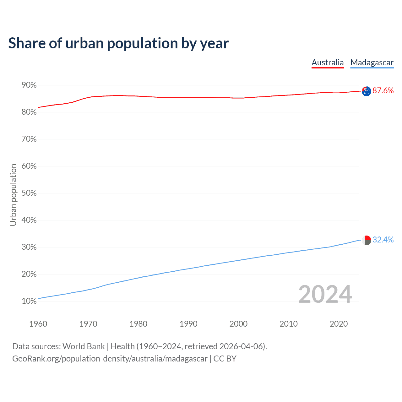 From 2004 to 2024, the share of urban population changed from 85.5% to 87.6% in Australia and from 26.2% to 32.4% in Madagascar.