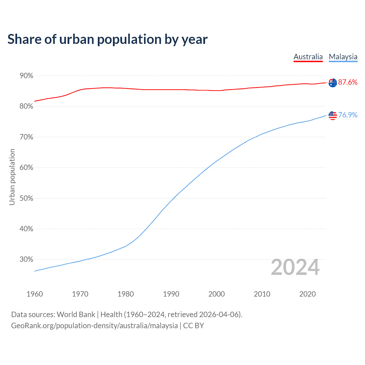 From 2004 to 2024, the share of urban population changed from 85.5% to 87.6% in Australia and from 66.1% to 76.9% in Malaysia.