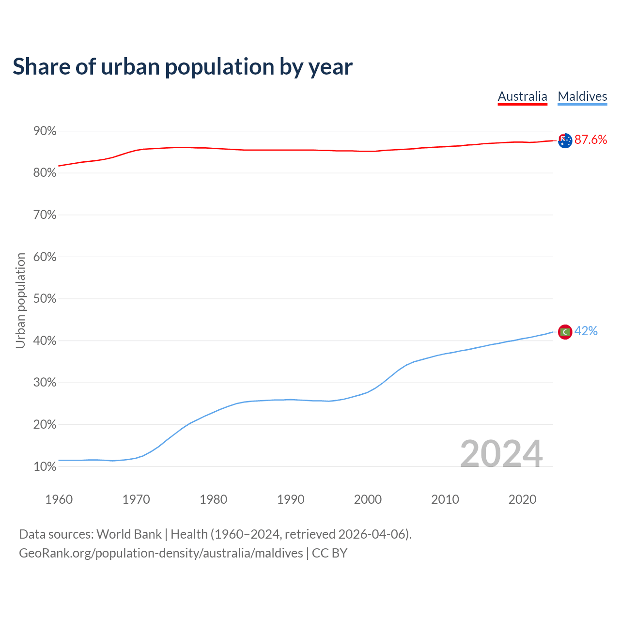 From 2004 to 2024, the share of urban population changed from 85.5% to 87.6% in Australia and from 32.9% to 42% in Maldives.