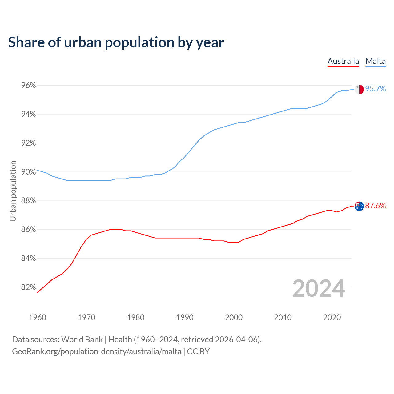 From 2004 to 2024, the share of urban population changed from 85.5% to 87.6% in Australia and from 93.6% to 95.7% in Malta.