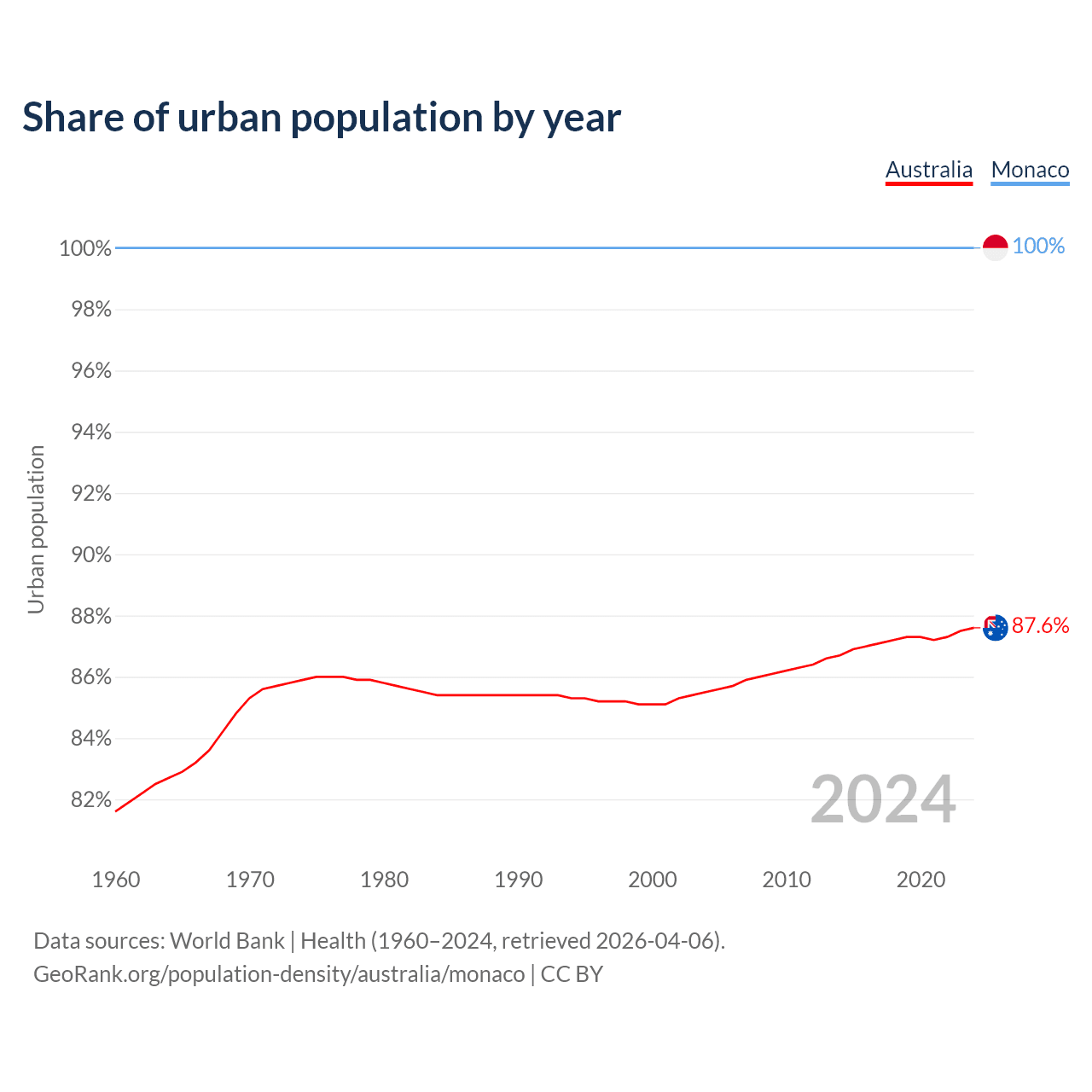 From 2004 to 2024, the share of urban population changed from 85.5% to 87.6% in Australia and from 100% to 100% in Monaco.