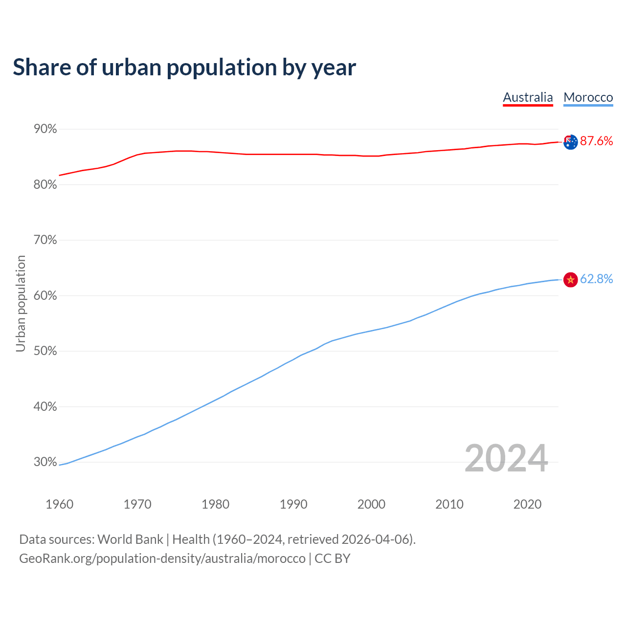 From 2004 to 2024, the share of urban population changed from 85.5% to 87.6% in Australia and from 55% to 62.8% in Morocco.