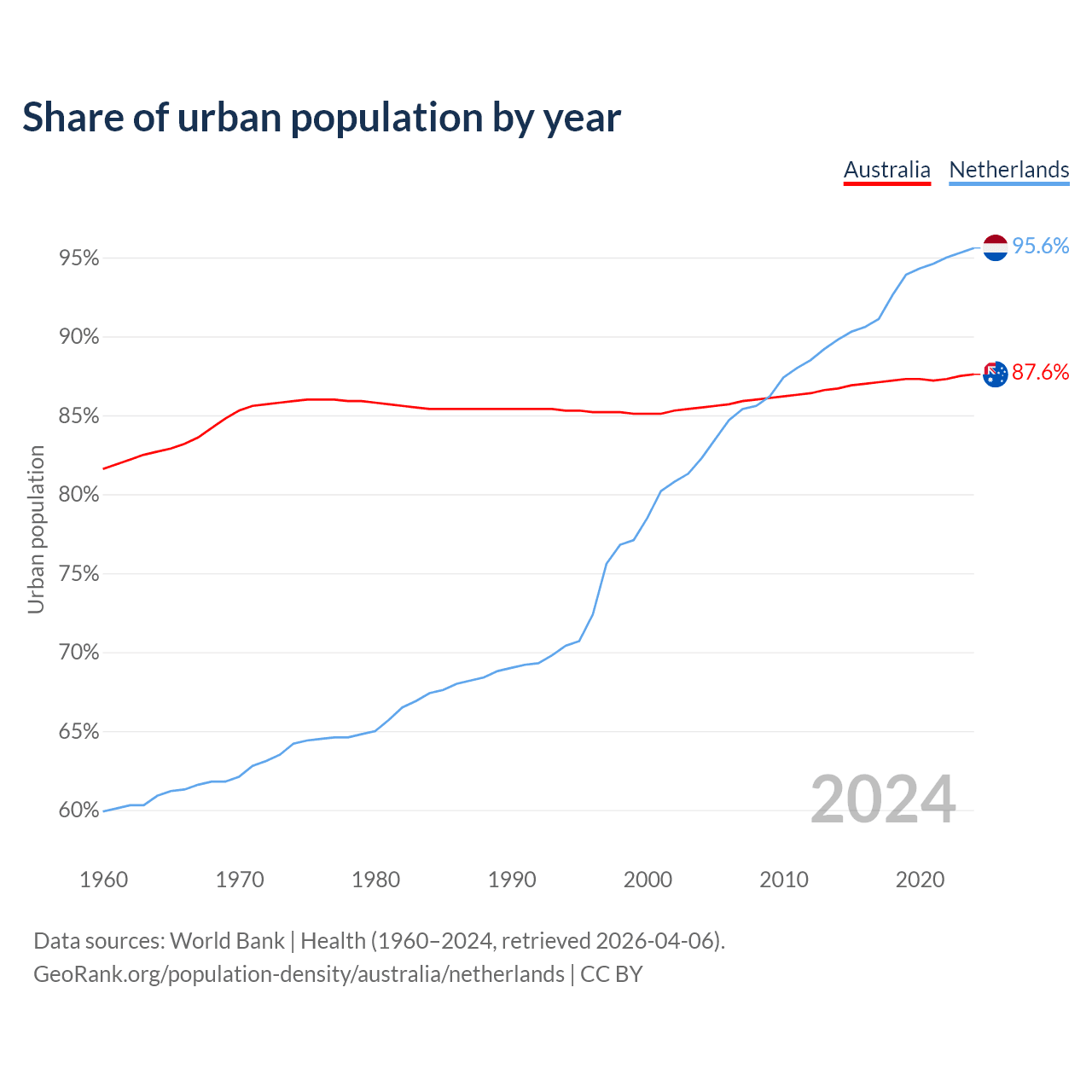 From 2004 to 2024, the share of urban population changed from 85.5% to 87.6% in Australia and from 82.3% to 95.6% in the Netherlands.