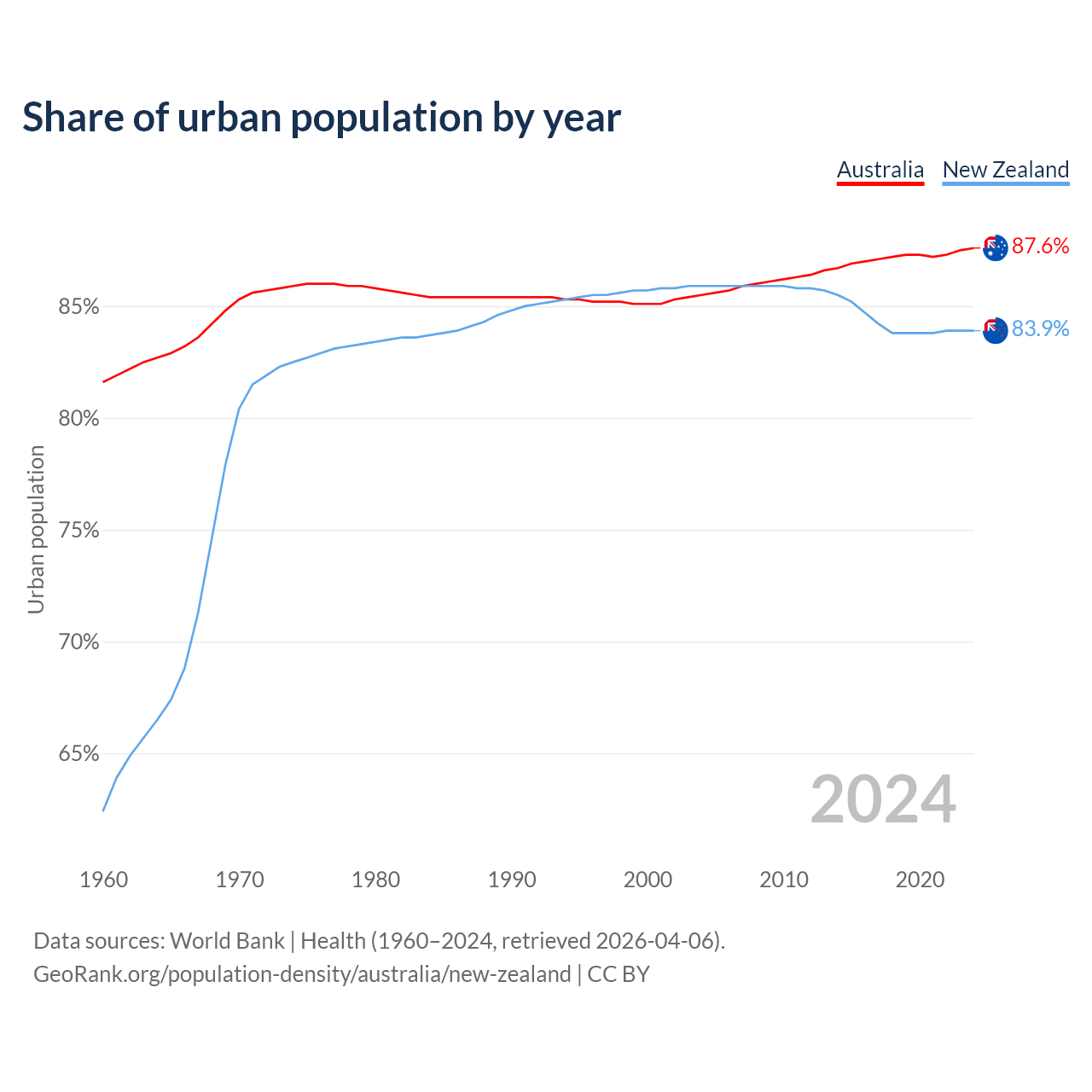 From 2004 to 2024, the share of urban population changed from 85.5% to 87.6% in Australia and from 85.9% to 83.9% in New Zealand.