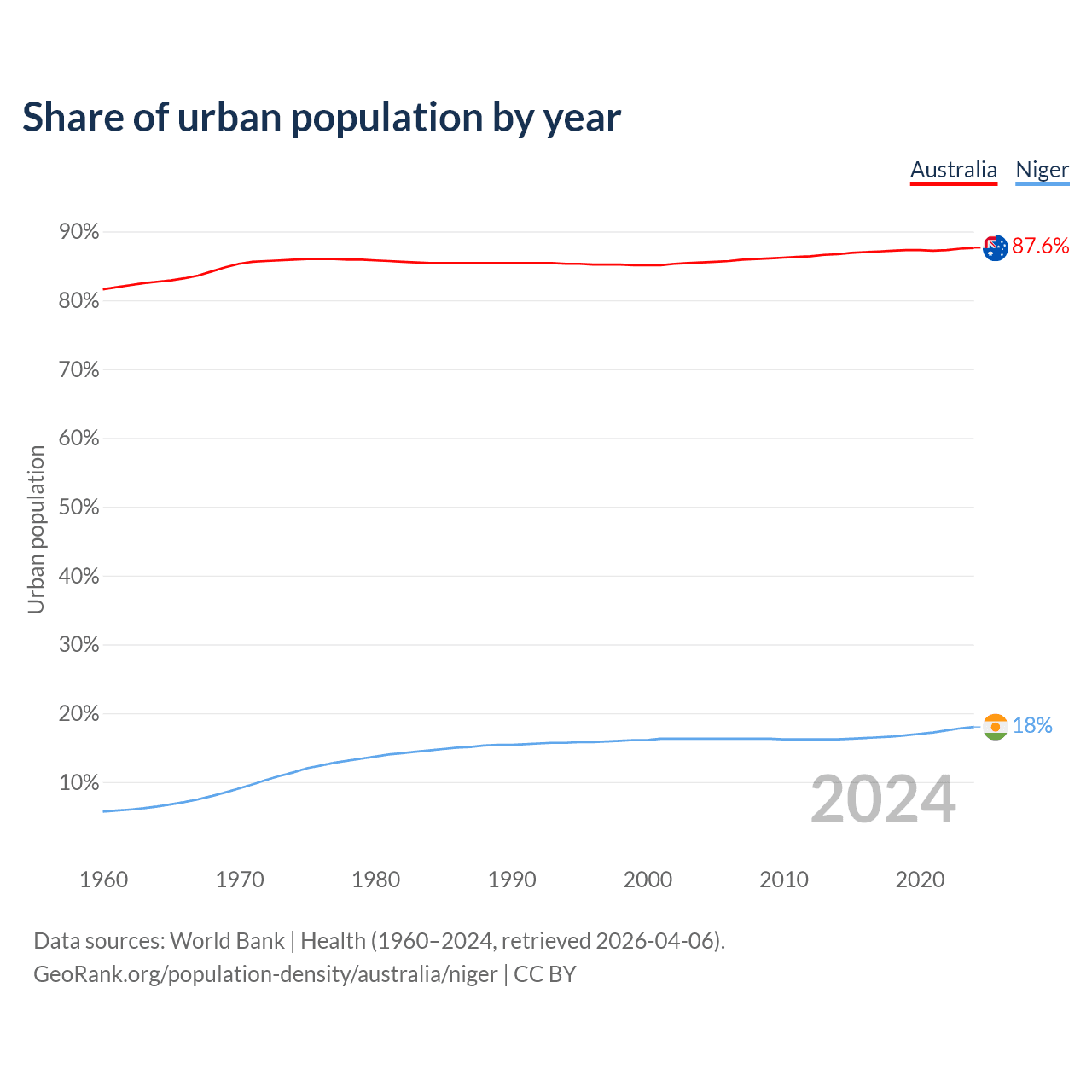 From 2004 to 2024, the share of urban population changed from 85.5% to 87.6% in Australia and from 16.3% to 18% in Niger.