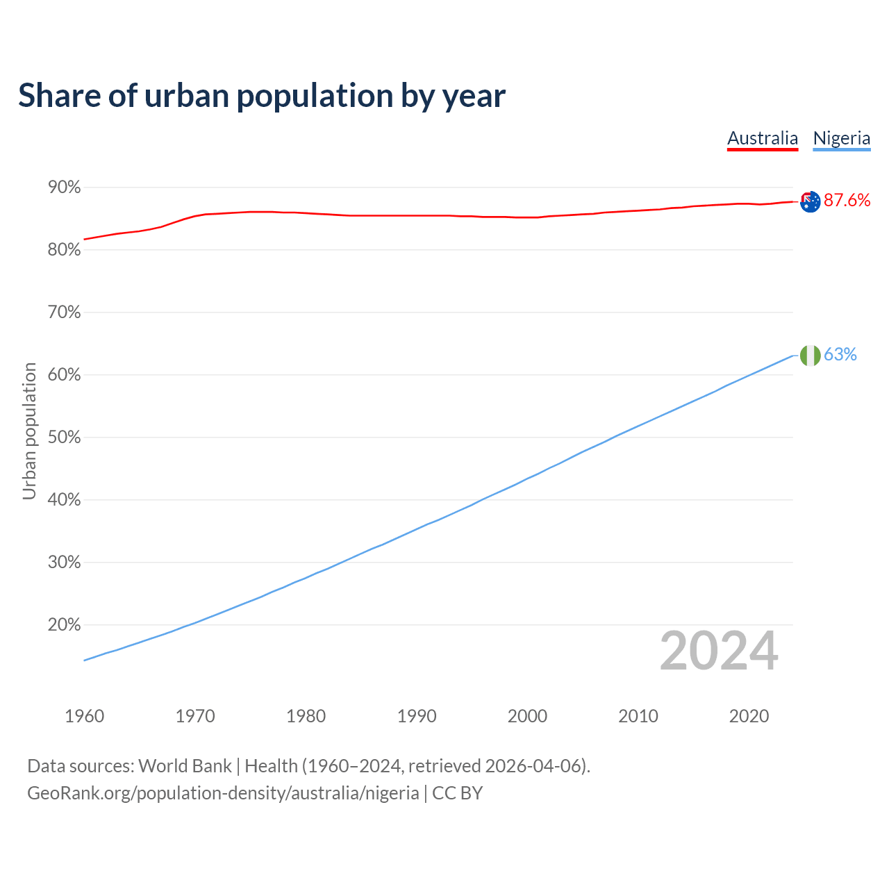 From 2004 to 2024, the share of urban population changed from 85.5% to 87.6% in Australia and from 46.7% to 63% in Nigeria.