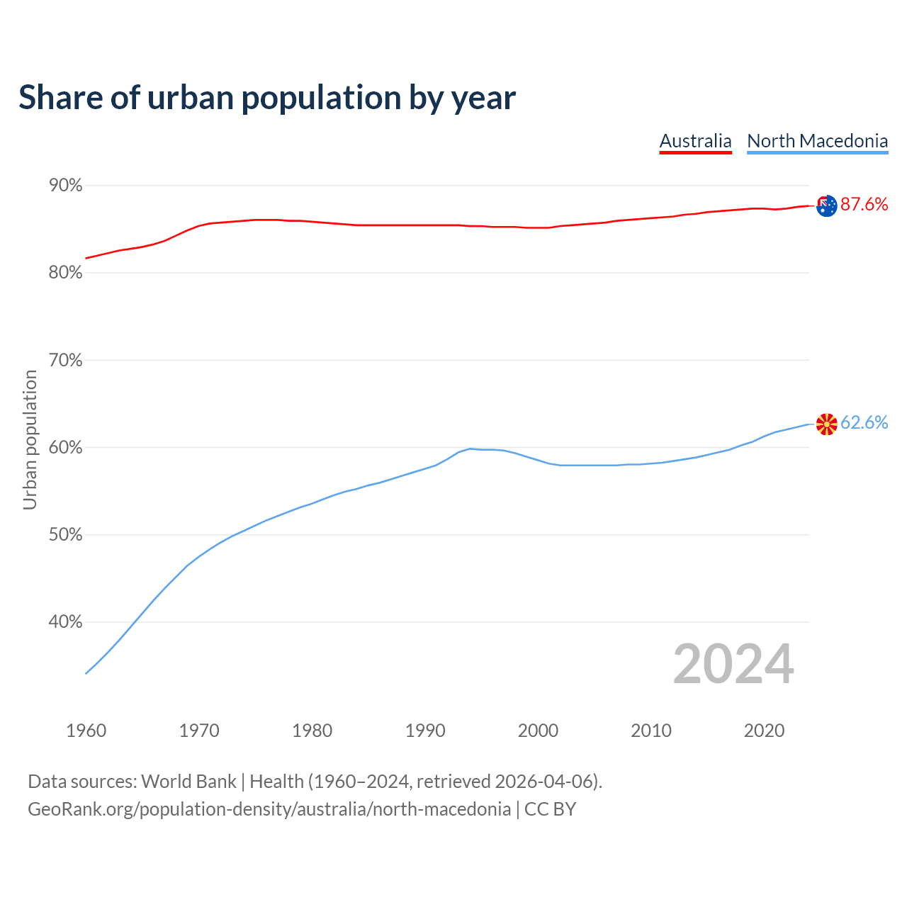 From 2004 to 2024, the share of urban population changed from 85.5% to 87.6% in Australia and from 57.9% to 62.6% in North Macedonia.