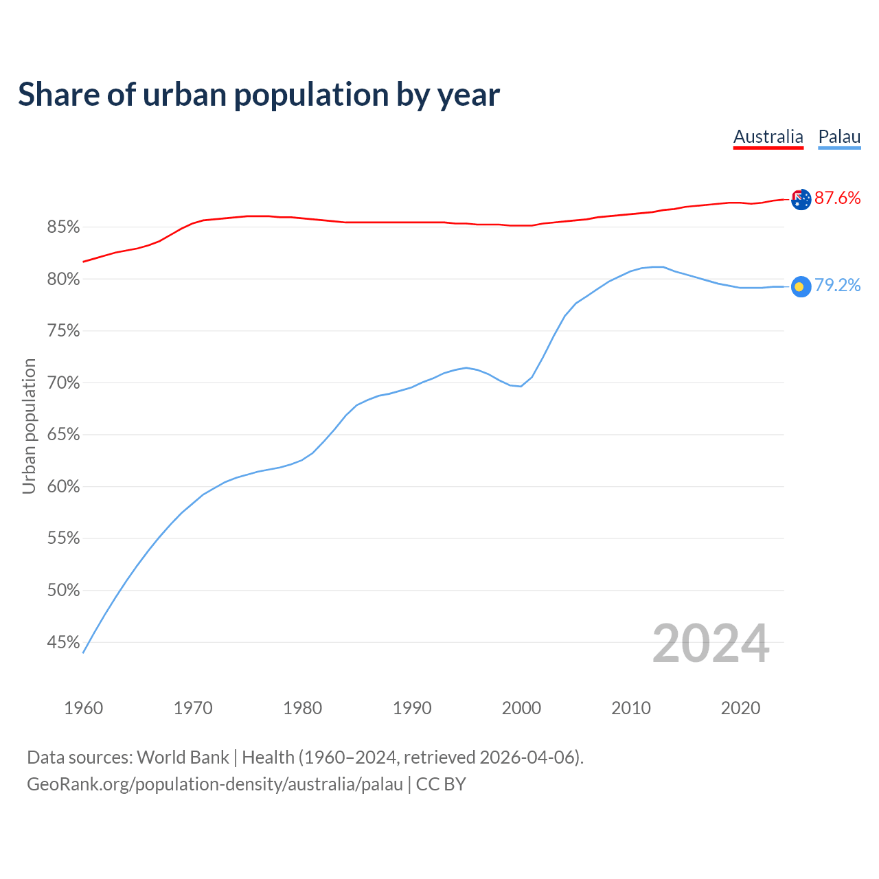 From 2004 to 2024, the share of urban population changed from 85.5% to 87.6% in Australia and from 76.4% to 79.2% in Palau.