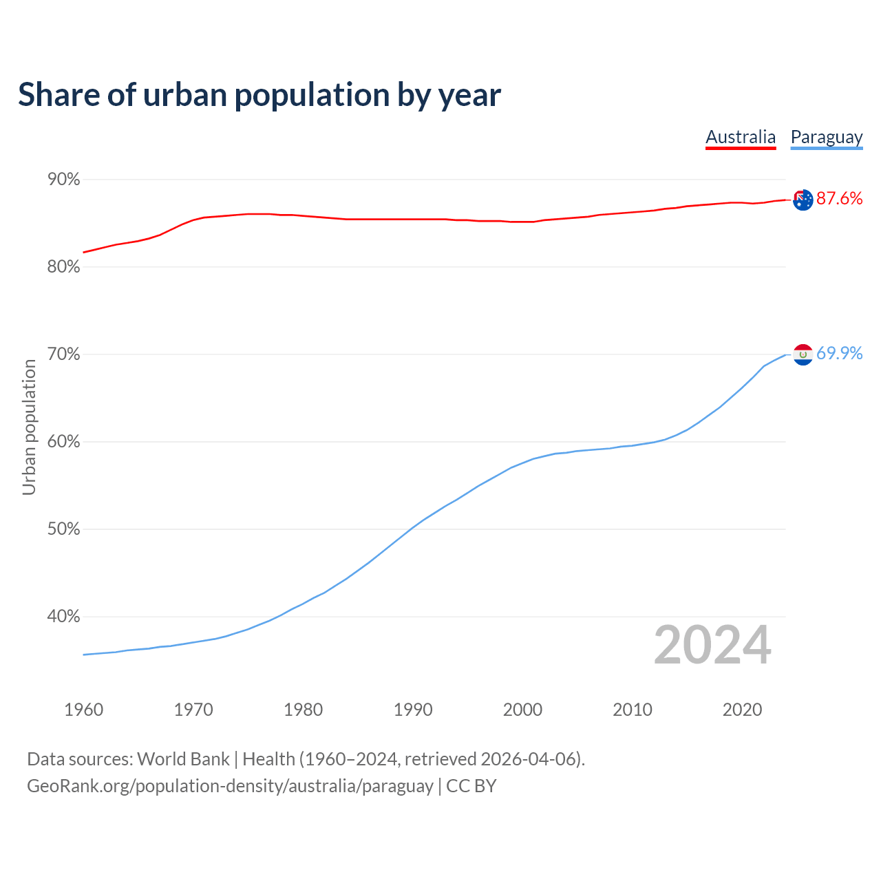 From 2004 to 2024, the share of urban population changed from 85.5% to 87.6% in Australia and from 58.7% to 69.9% in Paraguay.