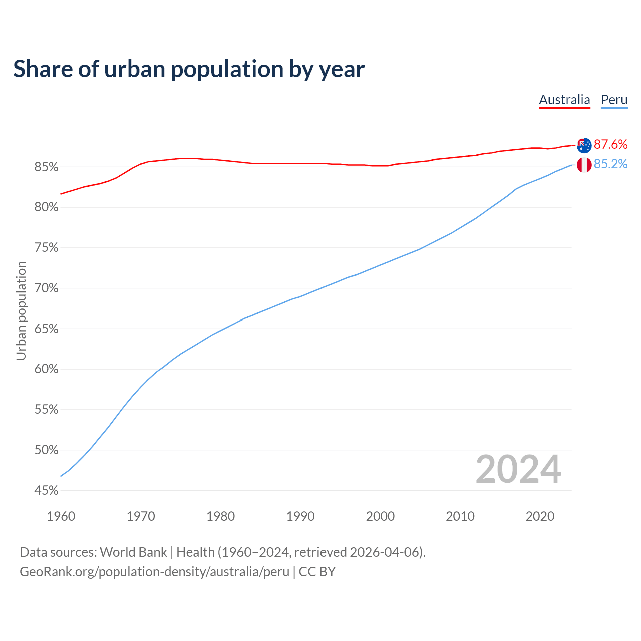 From 2004 to 2024, the share of urban population changed from 85.5% to 87.6% in Australia and from 74.4% to 85.2% in Peru.