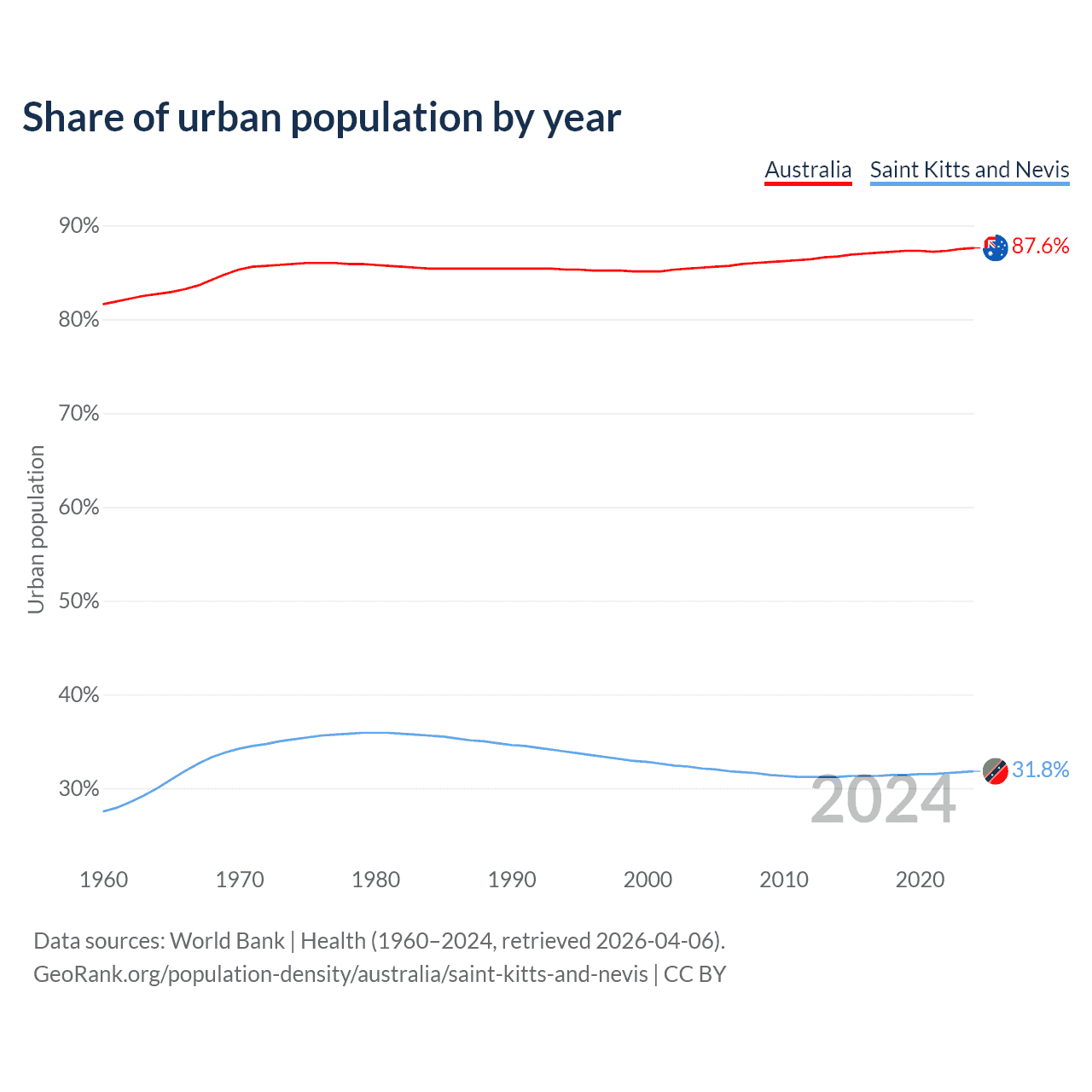 From 2004 to 2024, the share of urban population changed from 85.5% to 87.6% in Australia and from 32.1% to 31.8% in Saint Kitts and Nevis.