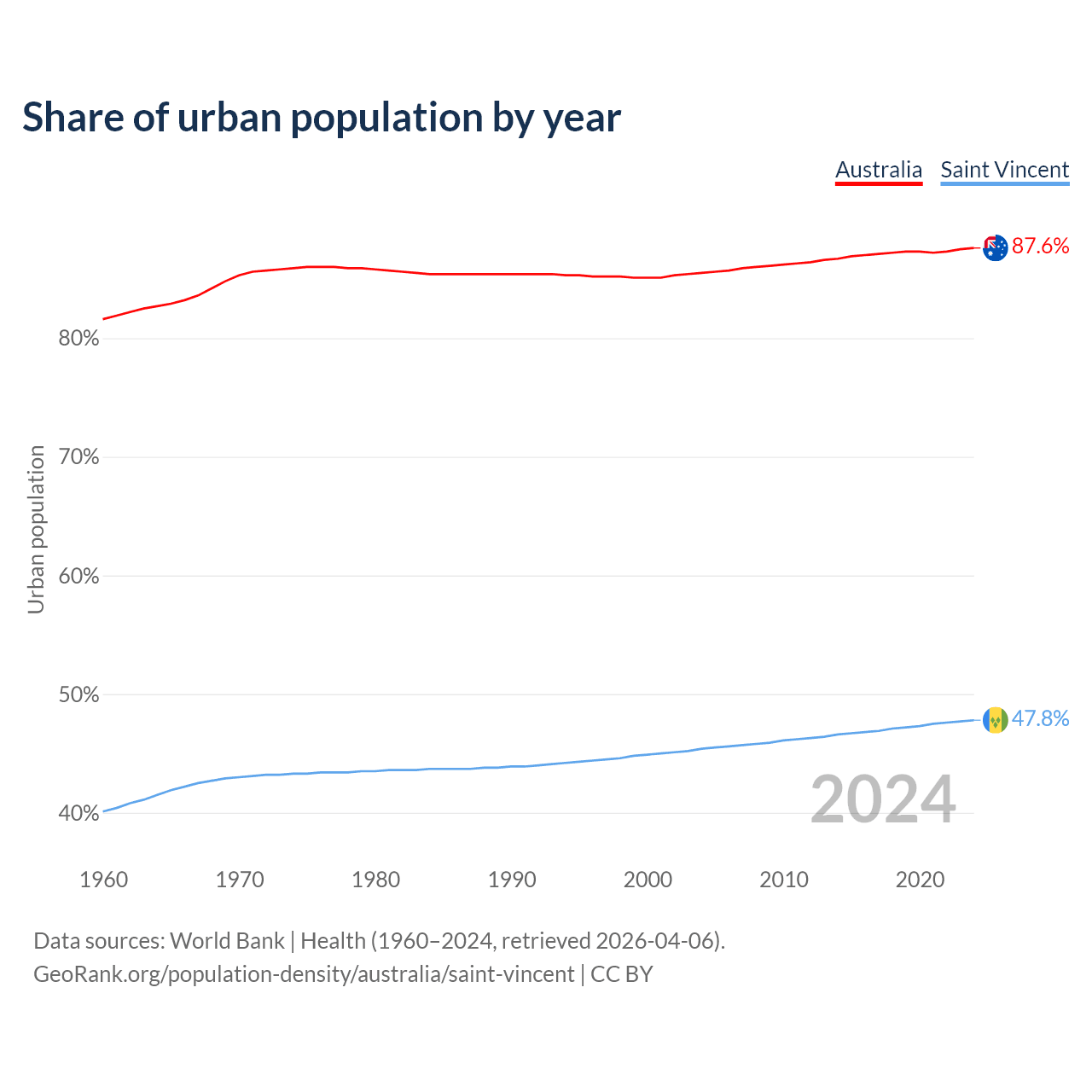 From 2004 to 2024, the share of urban population changed from 85.5% to 87.6% in Australia and from 45.4% to 47.8% in Saint Vincent.