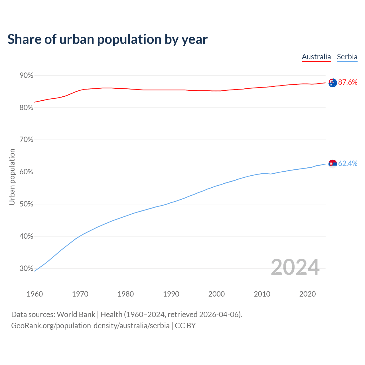From 2004 to 2024, the share of urban population changed from 85.5% to 87.6% in Australia and from 57.3% to 62.4% in Serbia.