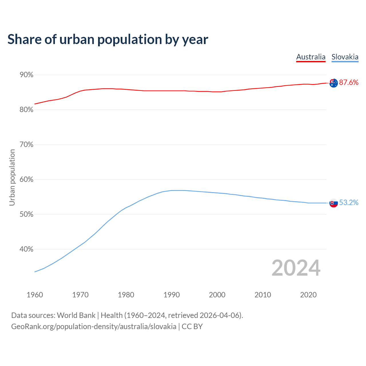 From 2004 to 2024, the share of urban population changed from 85.5% to 87.6% in Australia and from 55.6% to 53.2% in Slovakia.