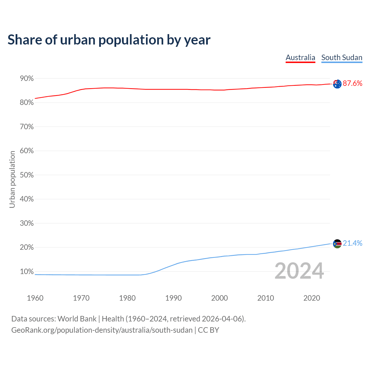 From 2004 to 2024, the share of urban population changed from 85.5% to 87.6% in Australia and from 16.8% to 21.4% in South Sudan.
