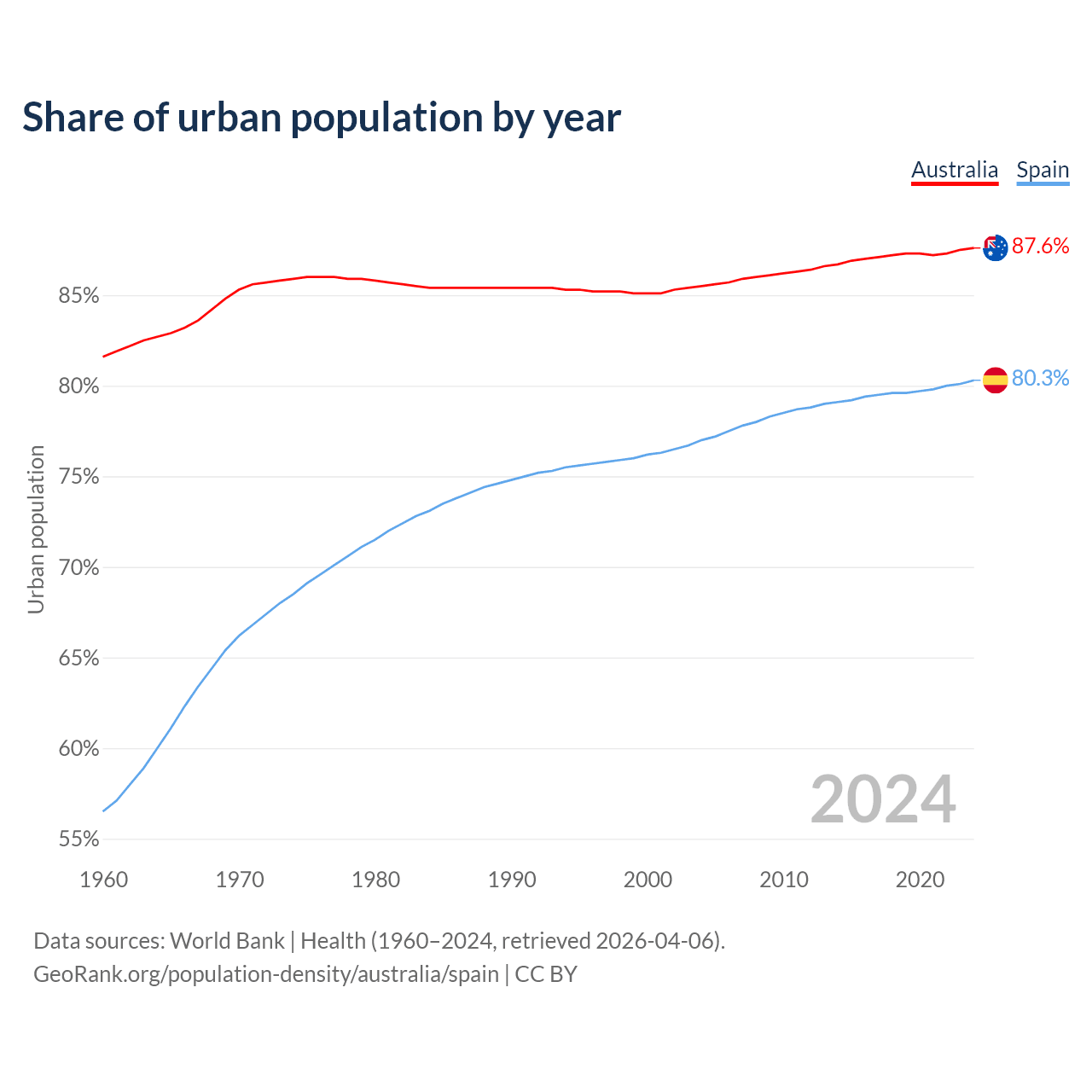 From 2004 to 2024, the share of urban population changed from 85.5% to 87.6% in Australia and from 77% to 80.3% in Spain.