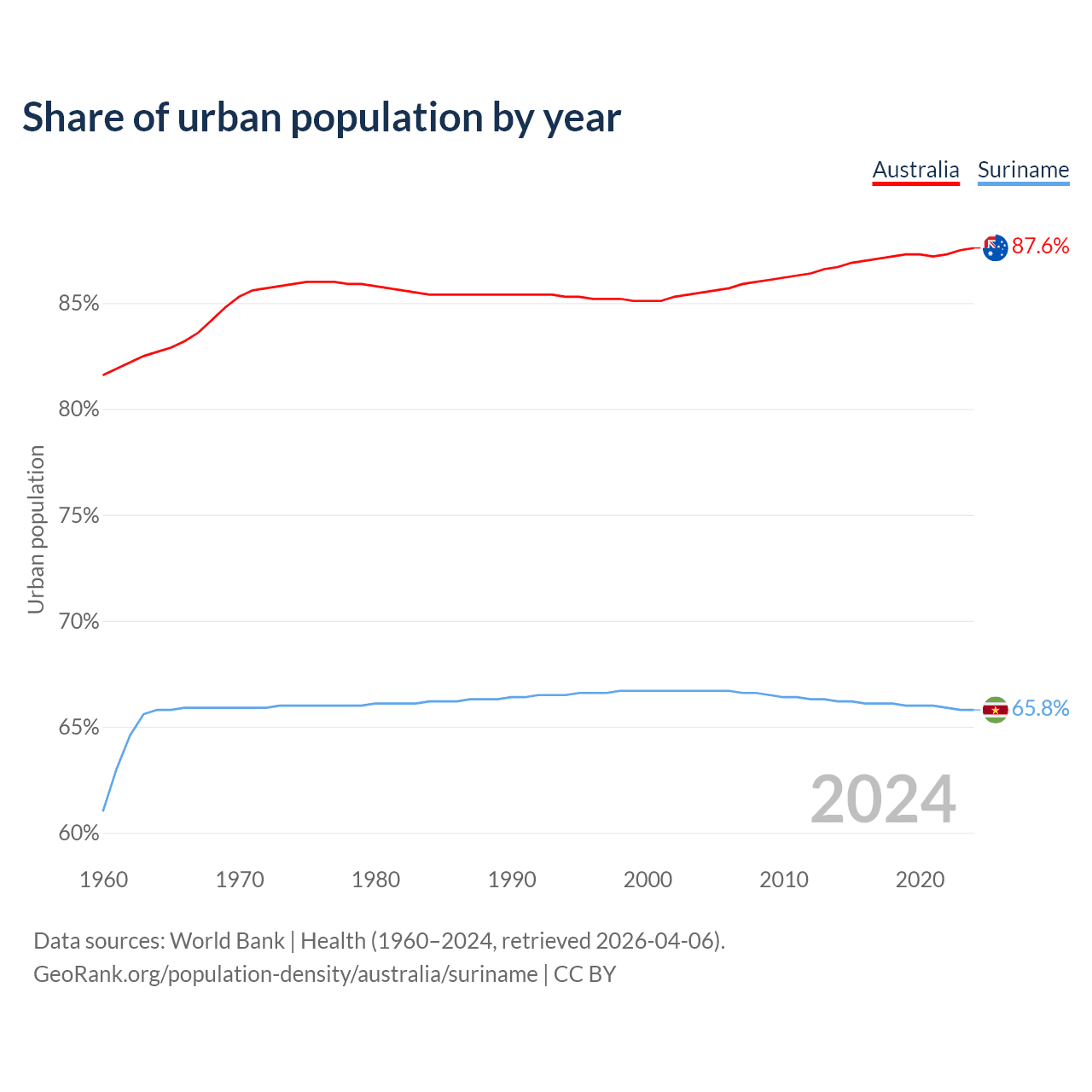 From 2004 to 2024, the share of urban population changed from 85.5% to 87.6% in Australia and from 66.7% to 65.8% in Suriname.