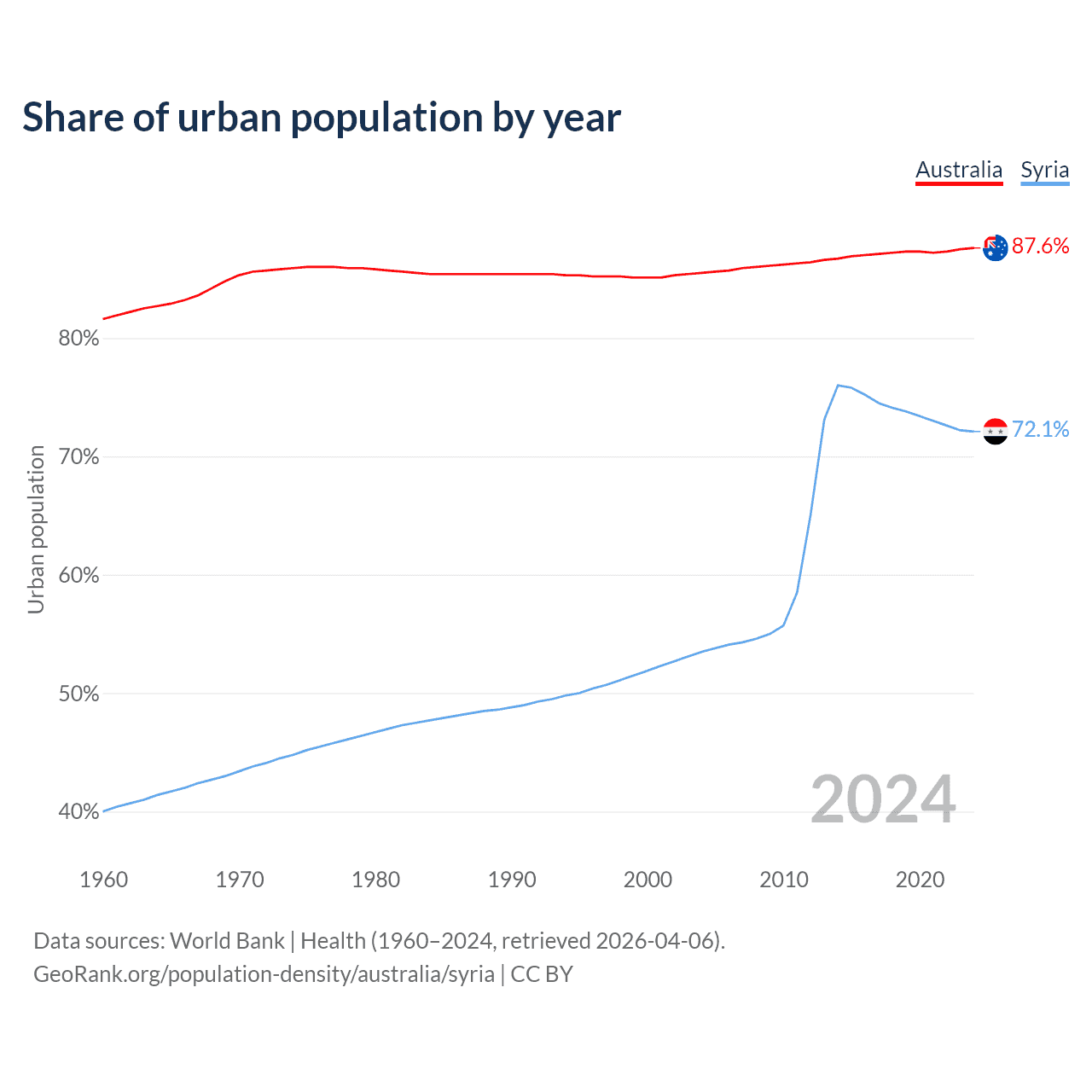 From 2004 to 2024, the share of urban population changed from 85.5% to 87.6% in Australia and from 53.5% to 72.1% in Syria.