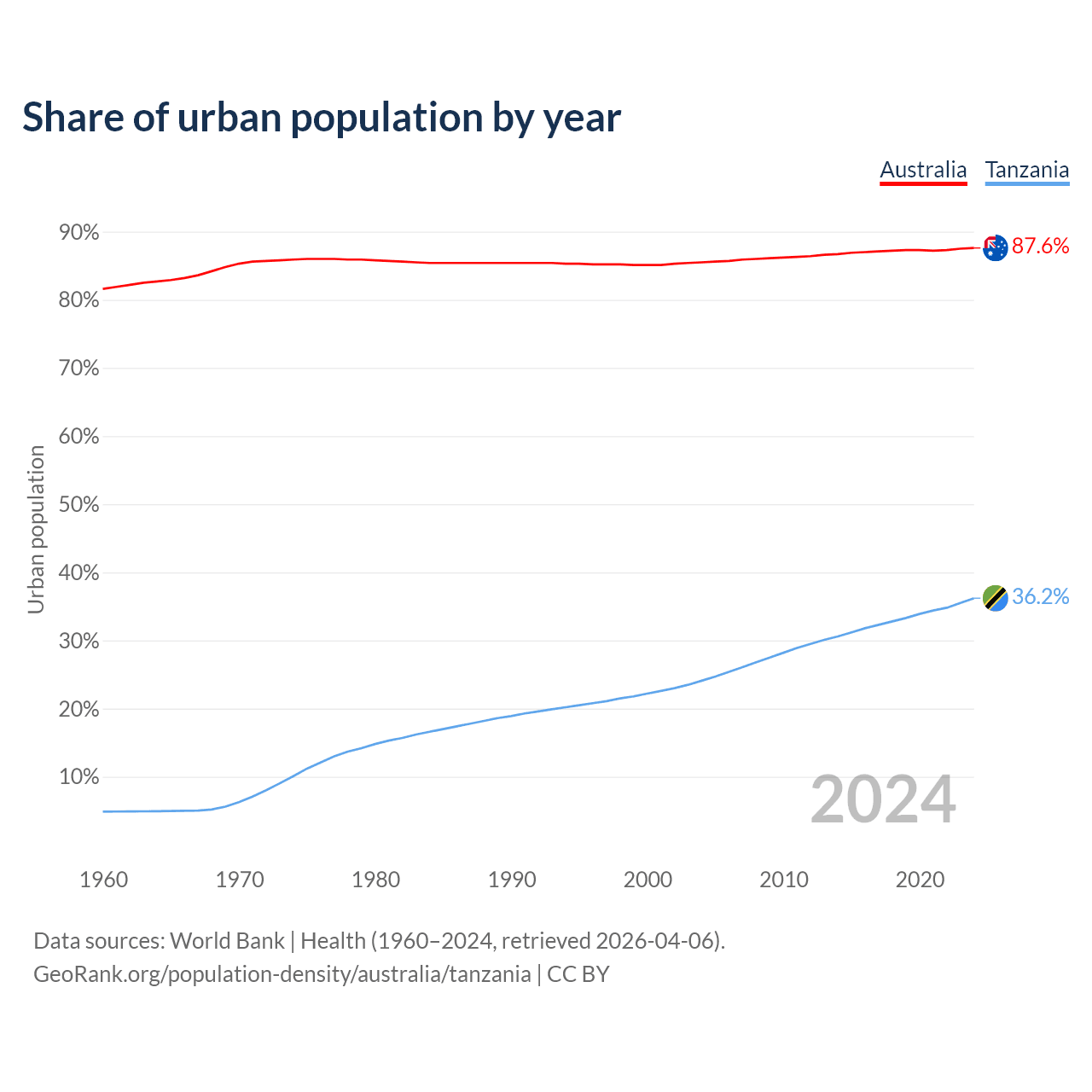 From 2004 to 2024, the share of urban population changed from 85.5% to 87.6% in Australia and from 24.1% to 36.2% in Tanzania.
