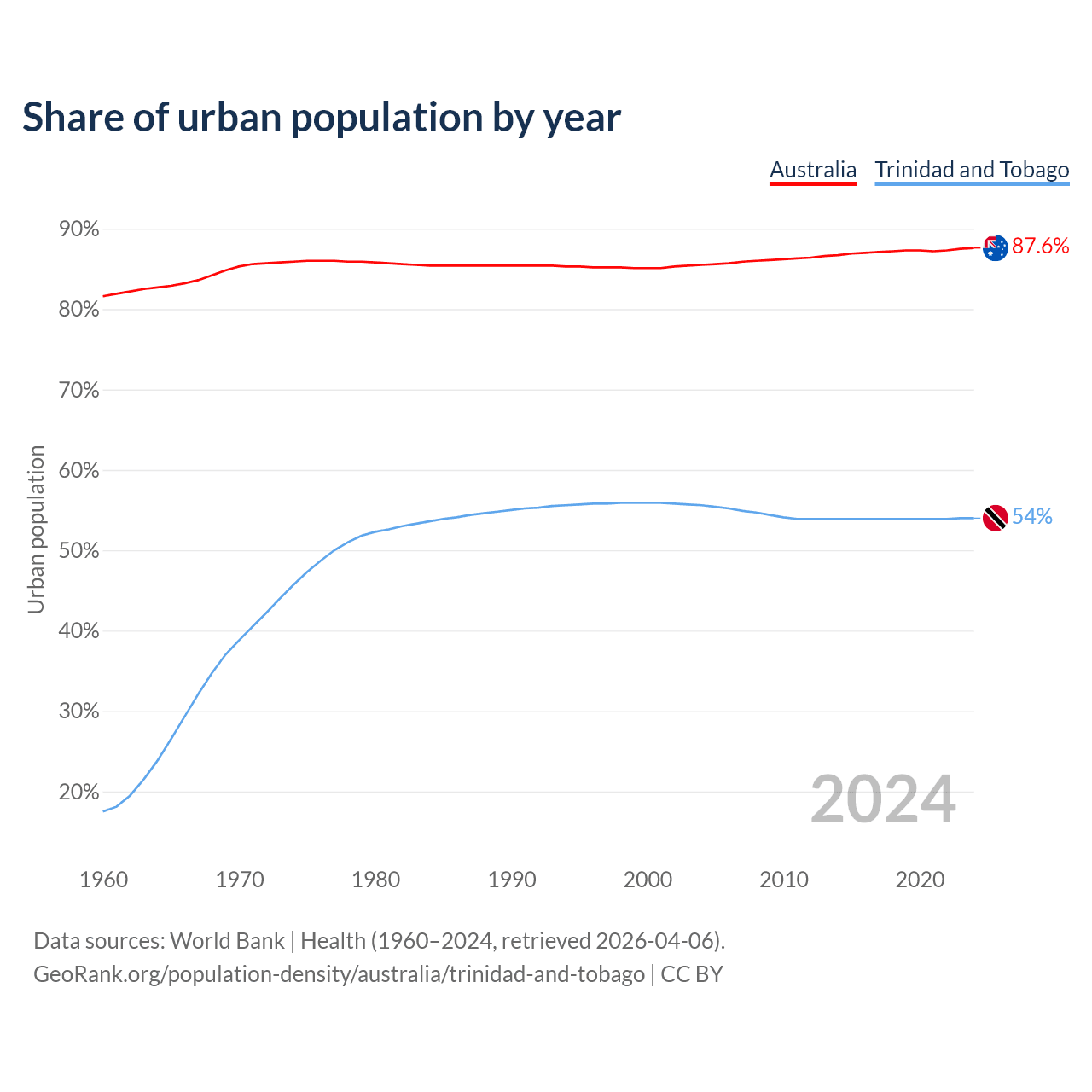 From 2004 to 2024, the share of urban population changed from 85.5% to 87.6% in Australia and from 55.6% to 54% in Trinidad and Tobago.