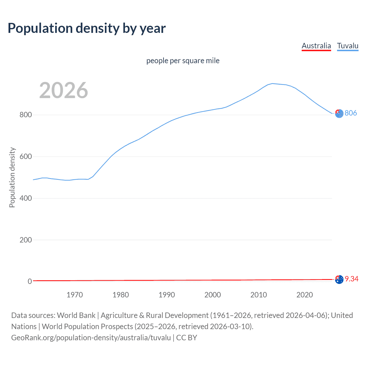 From 2006 to 2026, population density in Australia increased by 35.4%, compared to a 7.1% decline in Tuvalu.