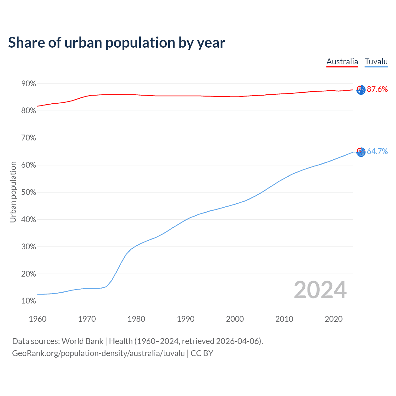 From 2004 to 2024, the share of urban population changed from 85.5% to 87.6% in Australia and from 48.4% to 64.7% in Tuvalu.
