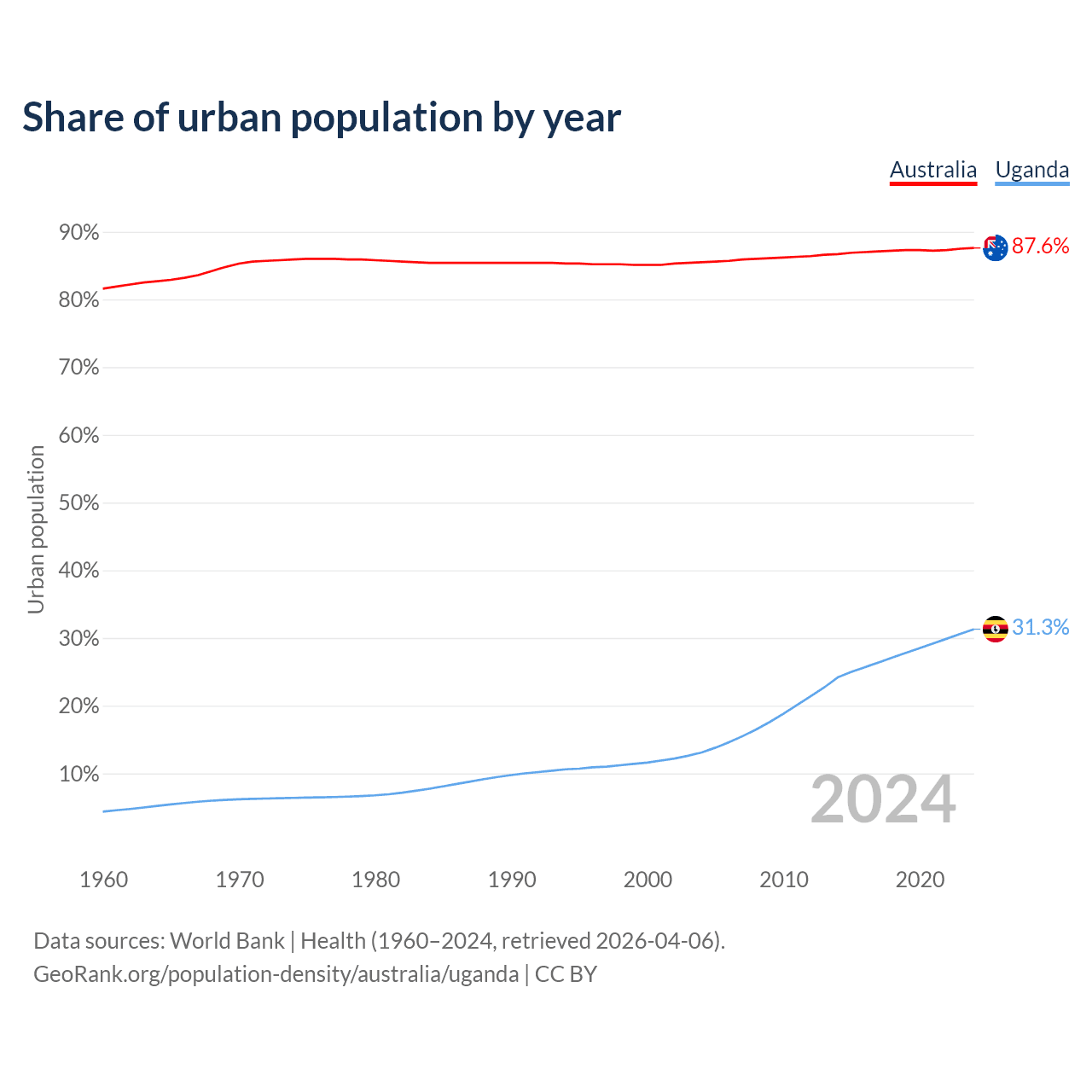 From 2004 to 2024, the share of urban population changed from 85.5% to 87.6% in Australia and from 13.1% to 31.3% in Uganda.