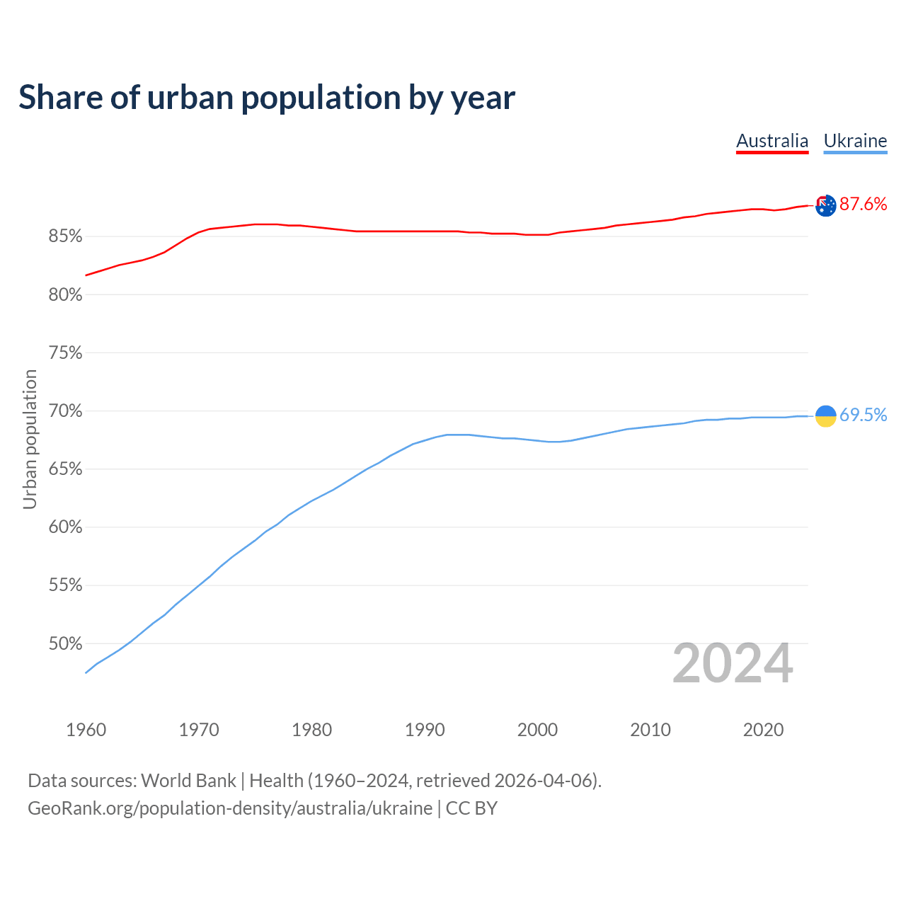 From 2004 to 2024, the share of urban population changed from 85.5% to 87.6% in Australia and from 67.6% to 69.5% in Ukraine.