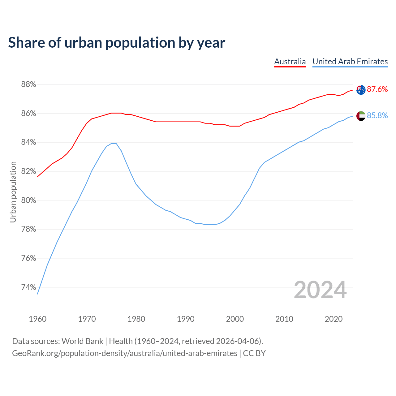 From 2004 to 2024, the share of urban population changed from 85.5% to 87.6% in Australia and from 81.5% to 85.8% in the United Arab Emirates.