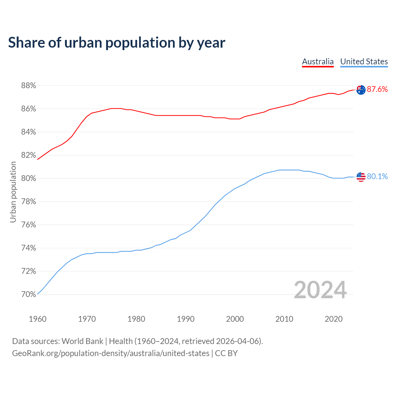 From 2004 to 2024, the share of urban population changed from 85.5% to 87.6% in Australia and from 80% to 80.1% in the United States.