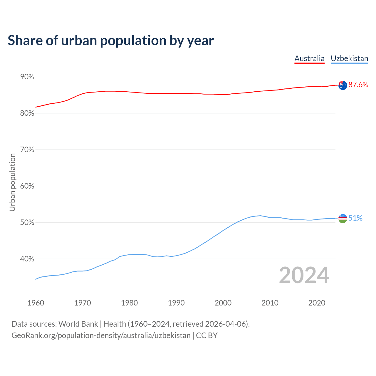 From 2004 to 2024, the share of urban population changed from 85.5% to 87.6% in Australia and from 50.6% to 51% in Uzbekistan.
