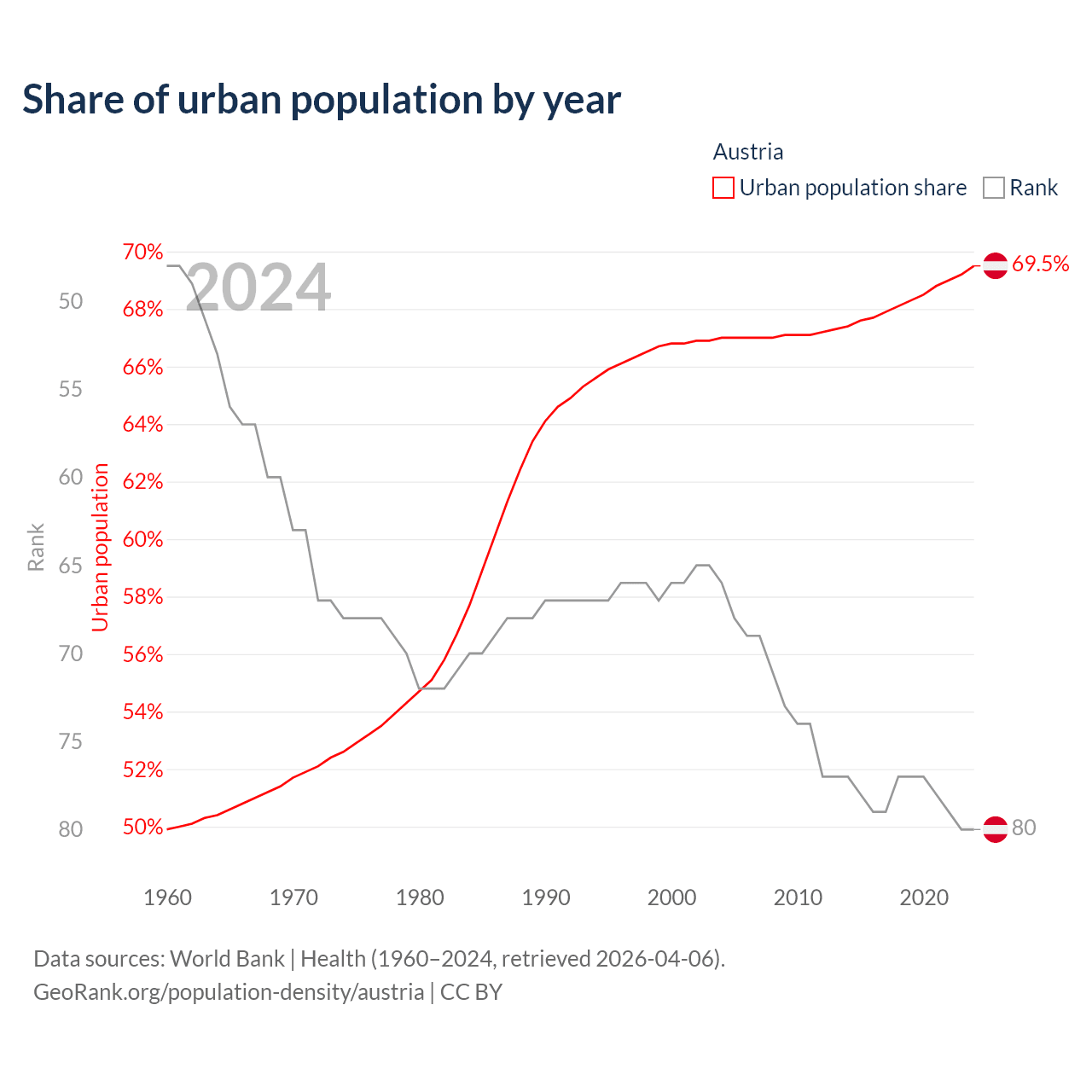 This chart shows the share of urban population in Austria from 1960 to 2024: 49.9% lived in urban areas in 1960, 66.8% in 2000, and 69.5% in 2024.