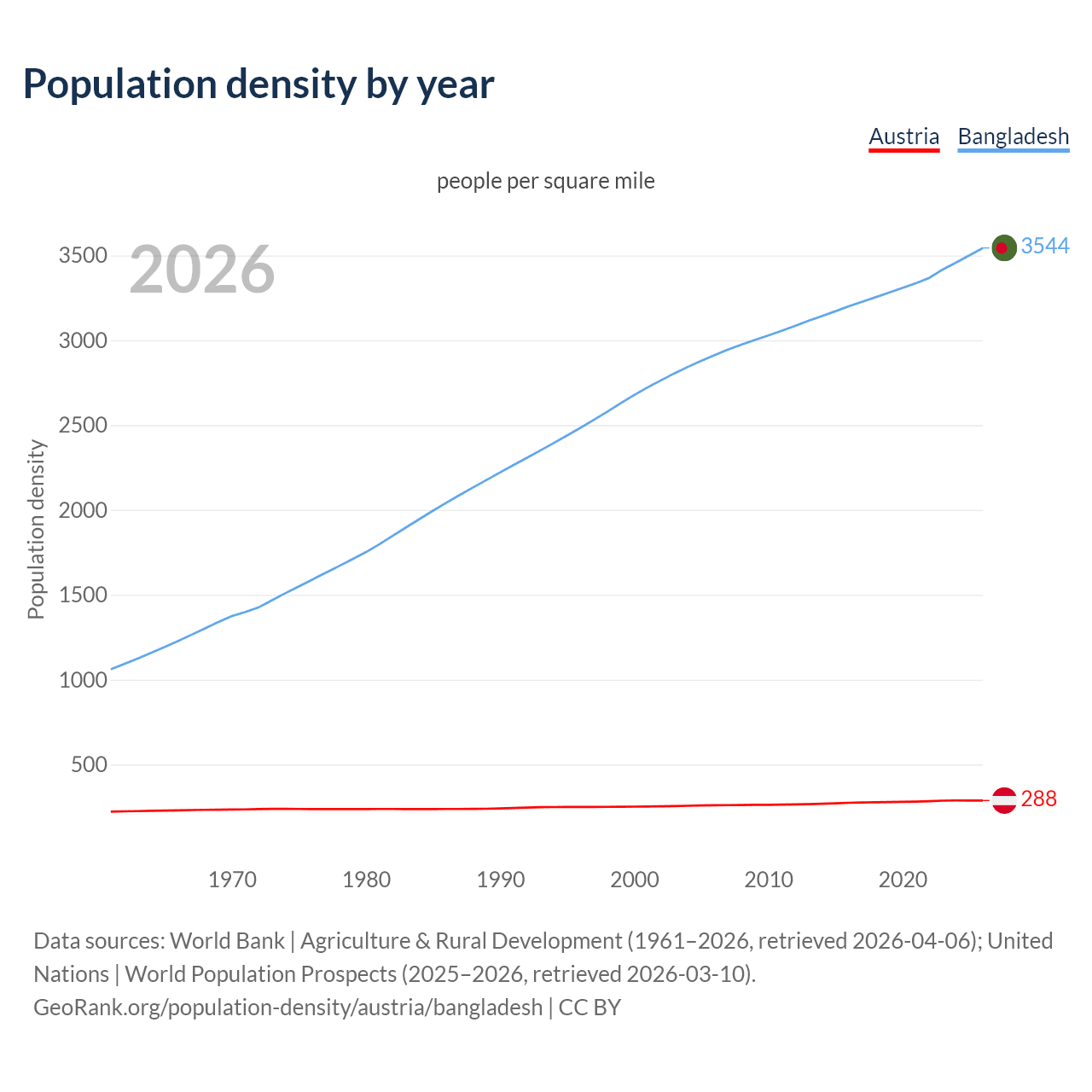 From 2006 to 2026, population density in Austria increased by 10.8%, compared to a 21.6% growth in Bangladesh.