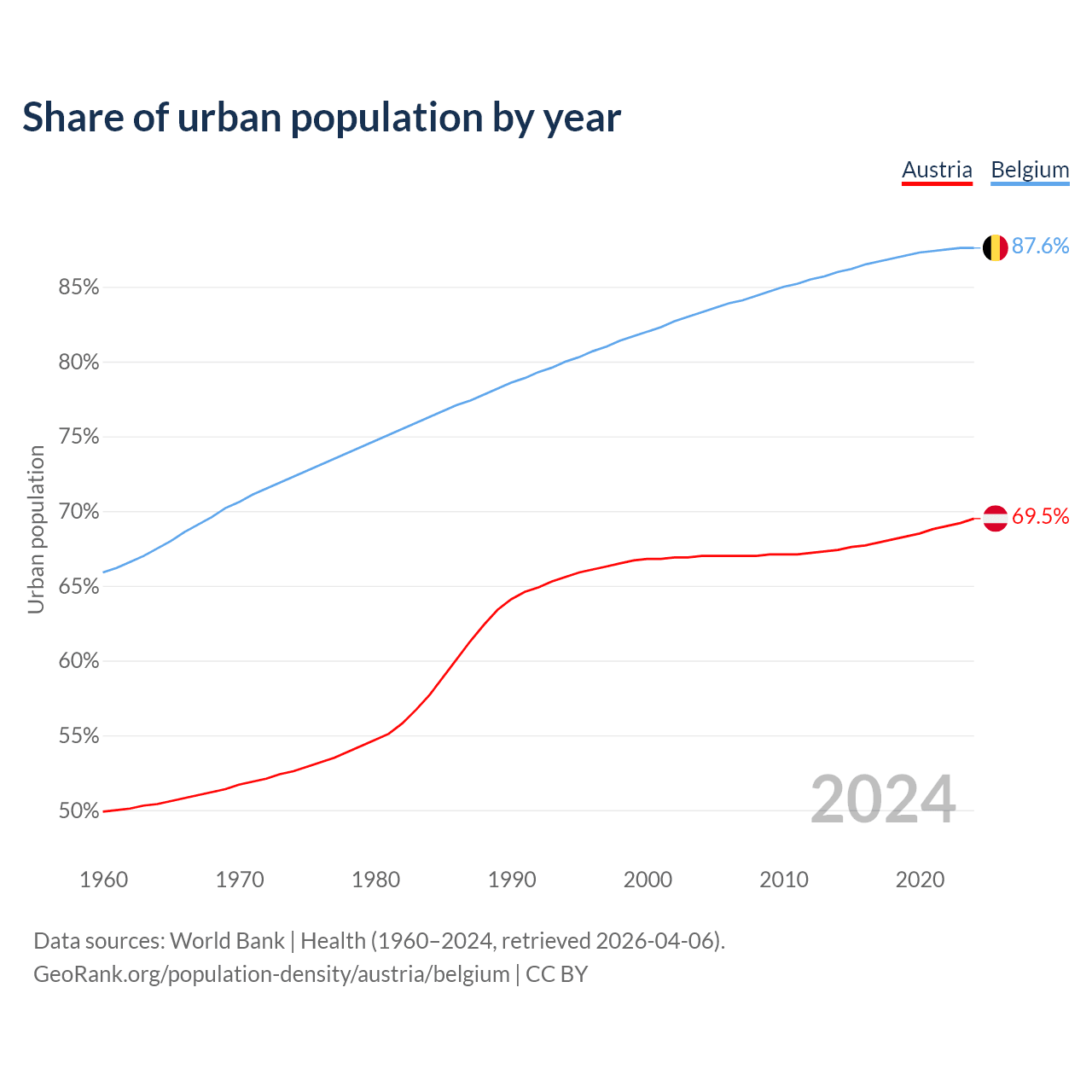 From 2004 to 2024, the share of urban population changed from 67% to 69.5% in Austria and from 83.3% to 87.6% in Belgium.