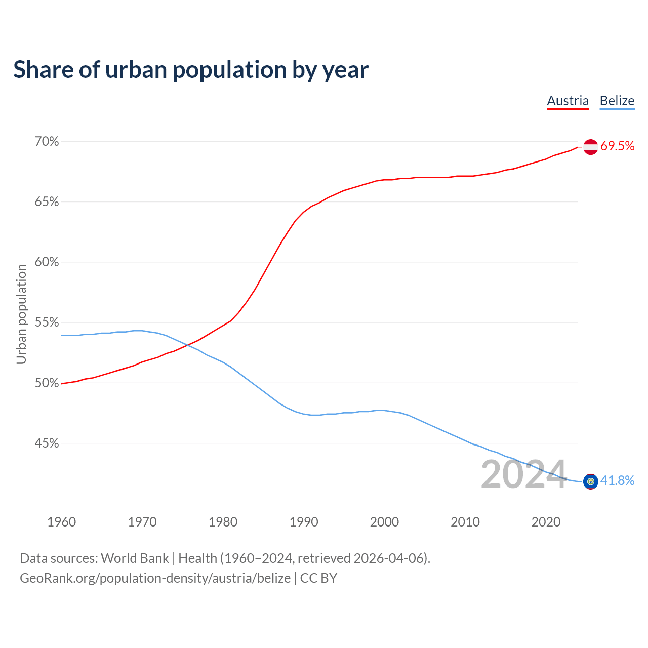 From 2004 to 2024, the share of urban population changed from 67% to 69.5% in Austria and from 47% to 41.8% in Belize.