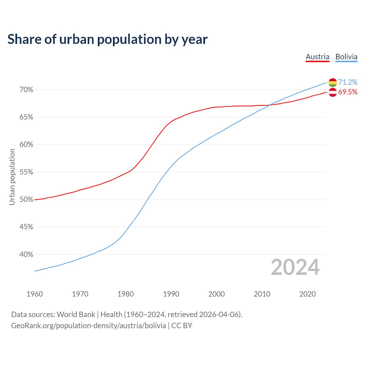 From 2004 to 2024, the share of urban population changed from 67% to 69.5% in Austria and from 63.8% to 71.2% in Bolivia.