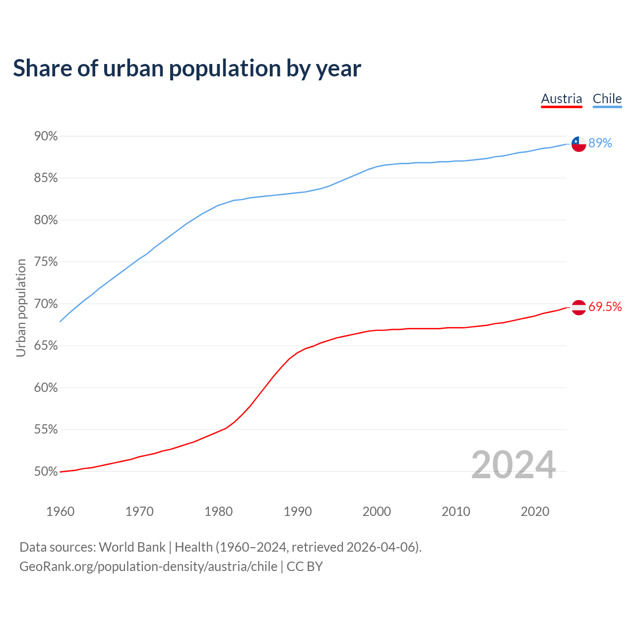 From 2004 to 2024, the share of urban population changed from 67% to 69.5% in Austria and from 86.7% to 89% in Chile.