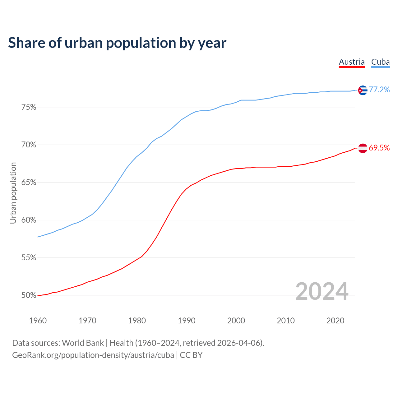 From 2004 to 2024, the share of urban population changed from 67% to 69.5% in Austria and from 75.9% to 77.2% in Cuba.