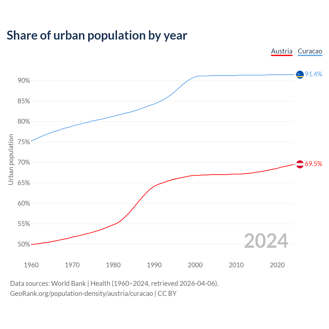 From 2004 to 2024, the share of urban population changed from 67% to 69.5% in Austria and from 91.2% to 91.4% in Curacao.